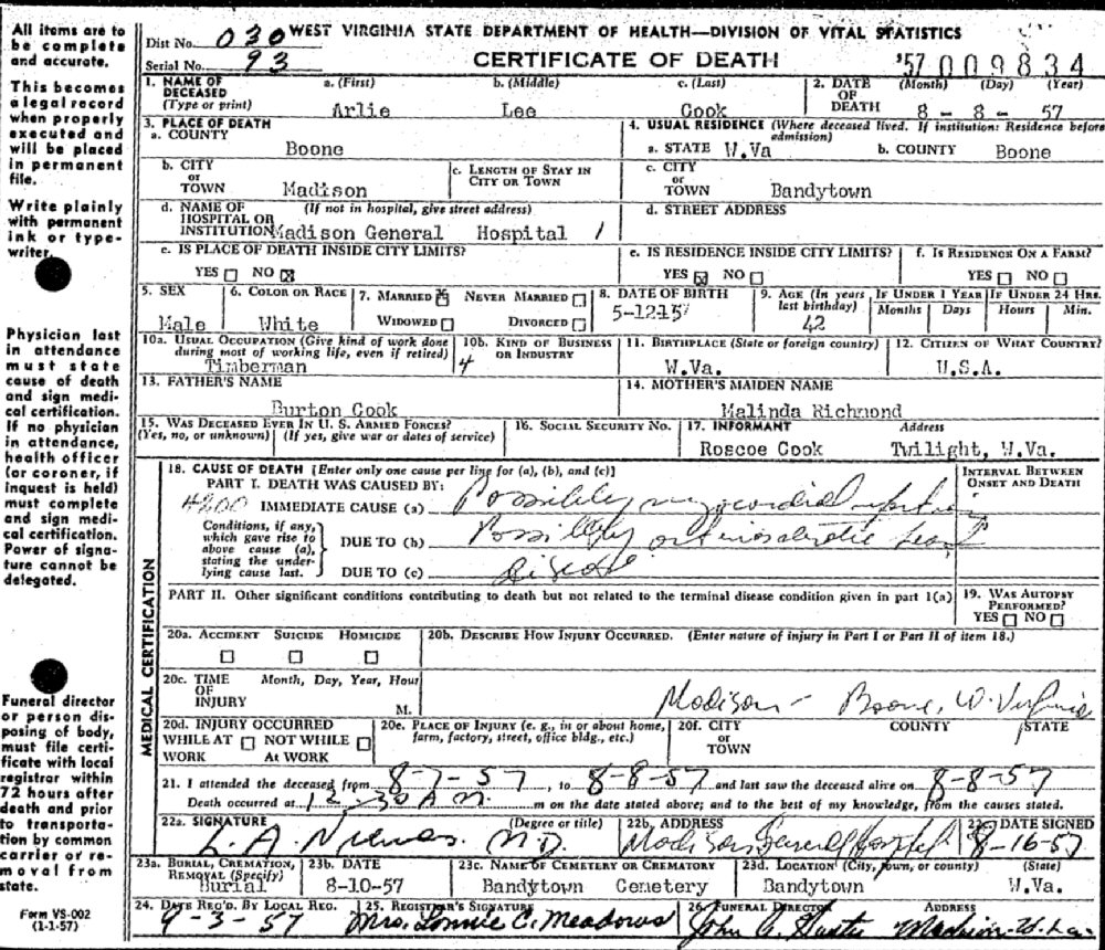 Last Residence: Bandytown, Boone County, West Virginia.