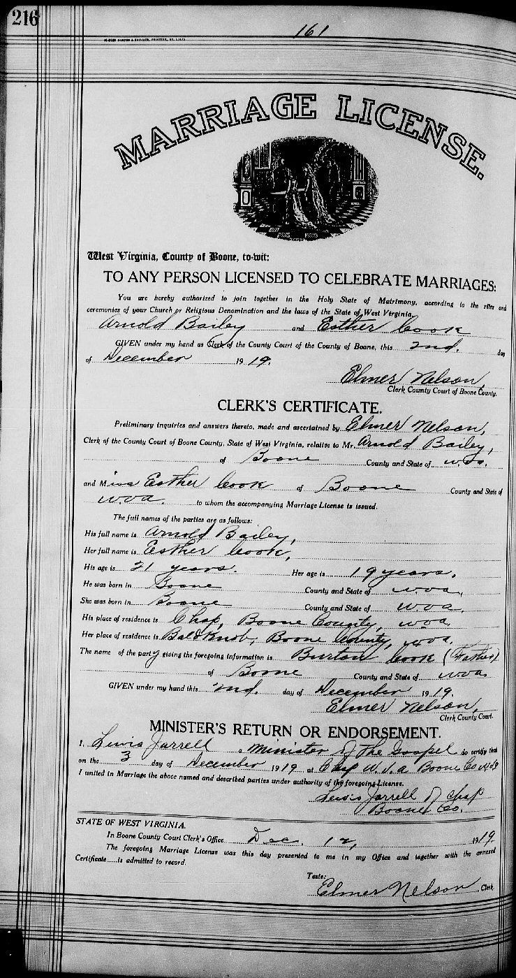 Married: Esther Cook December 3, 1919 in Chap, Boone County, West Virginia. (Marriage License: December 2, 1919.)