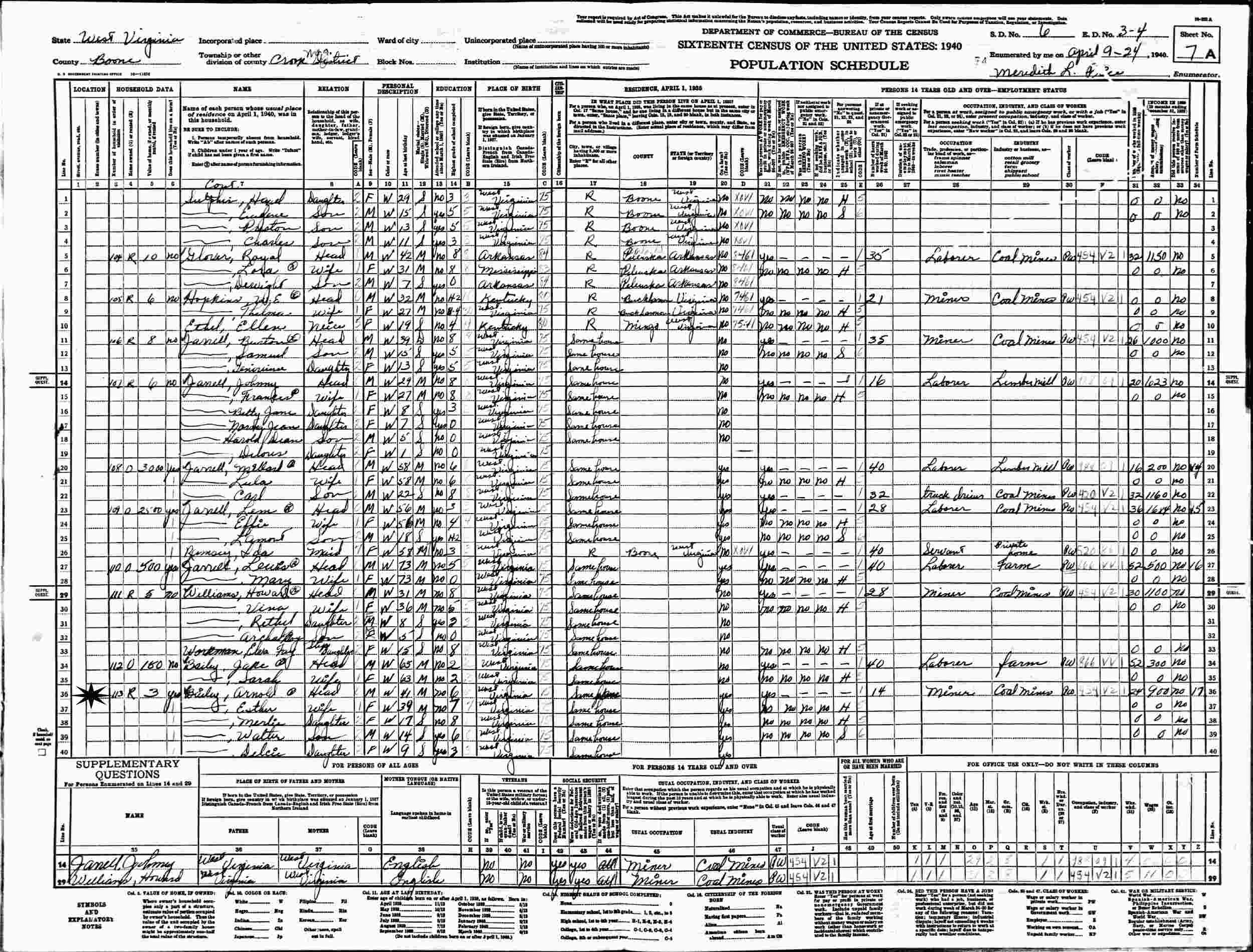 April 9-24, 1940 - Supervisor's District 6, Enumeration District 3-4, Crook Magisterial District, Boone County, West Virginia.