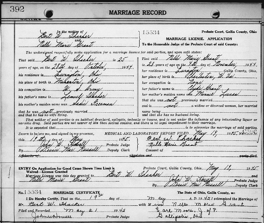 Married: Nelle Marie Grant May 19, 1945 in Gallipolis, Gallia County, Ohio.