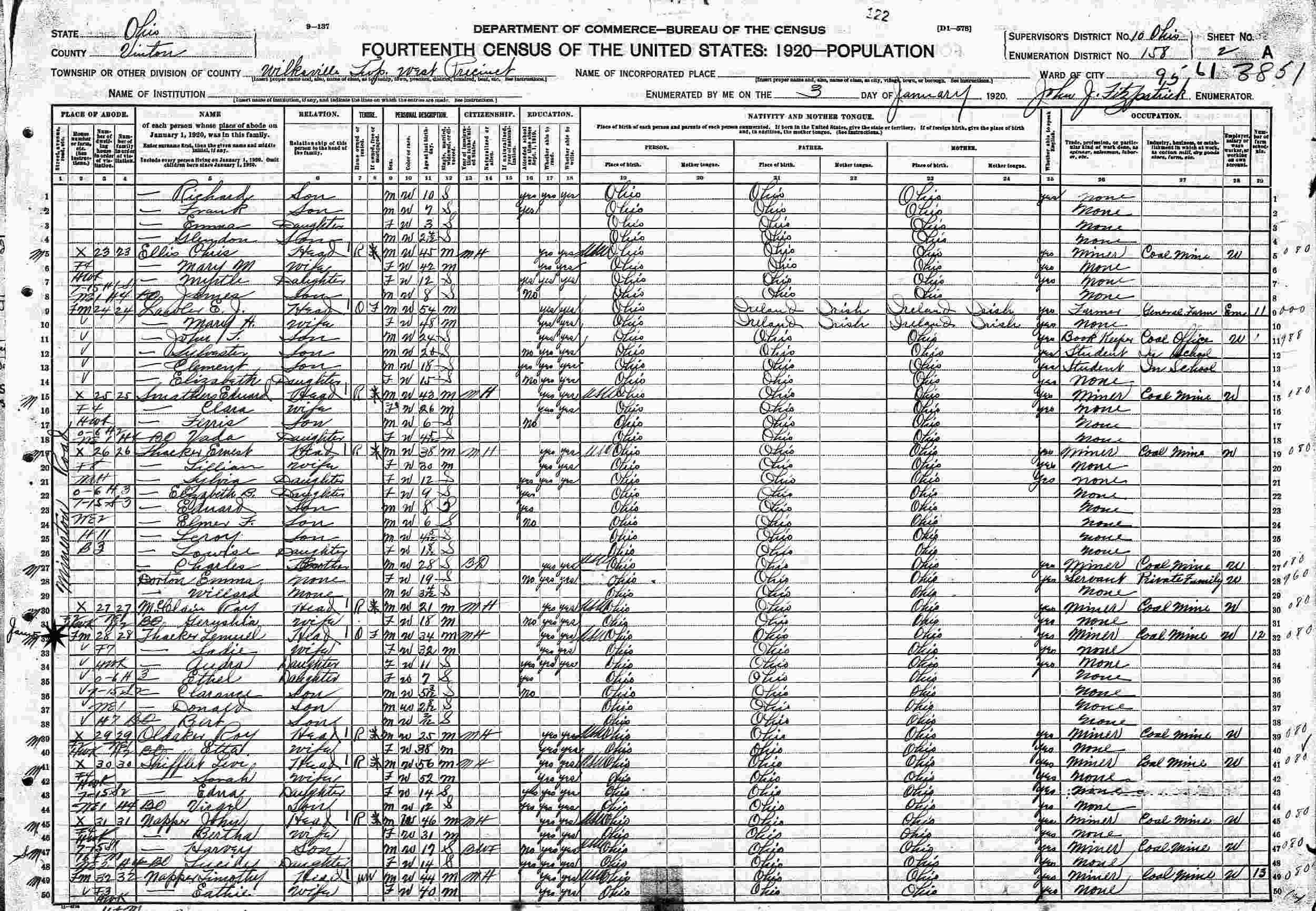 January 3, 1920 - Supervisor's District 10, Enuermation District 158, Wilkesville Township, Vinton County, Ohio.
