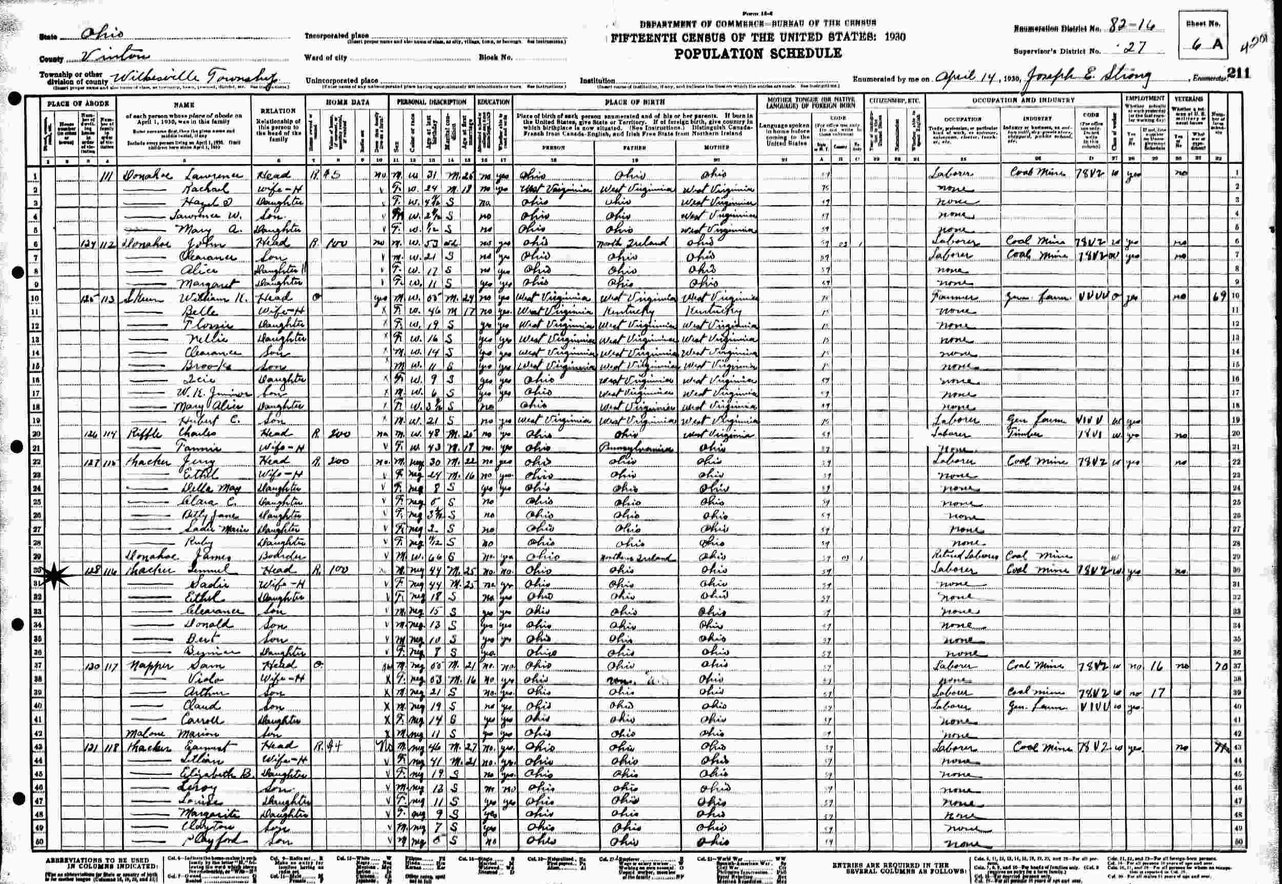 April 14, 1930 - Supervisor's District 27, Enumeration District 82-16, Wilkesville Township, Vinton County, Ohio.