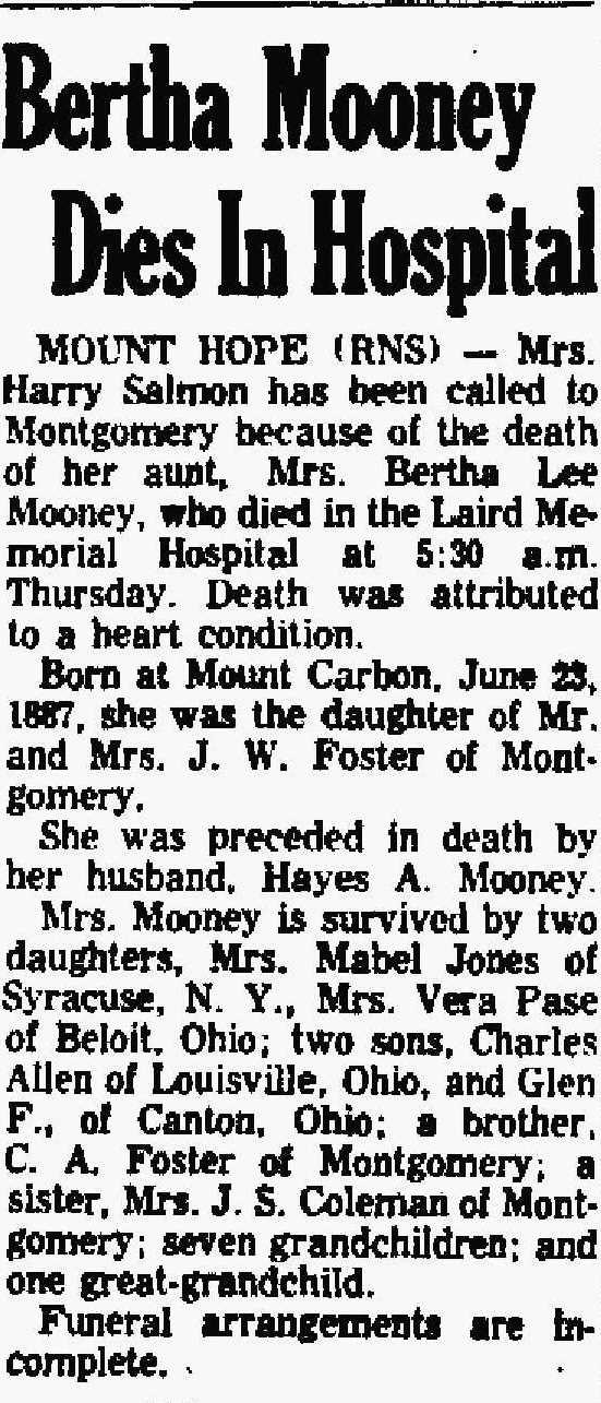 Died: August 4, 1960 in Laird Memorial Hospital, Montgomery, Fayette County, West Virginia.
