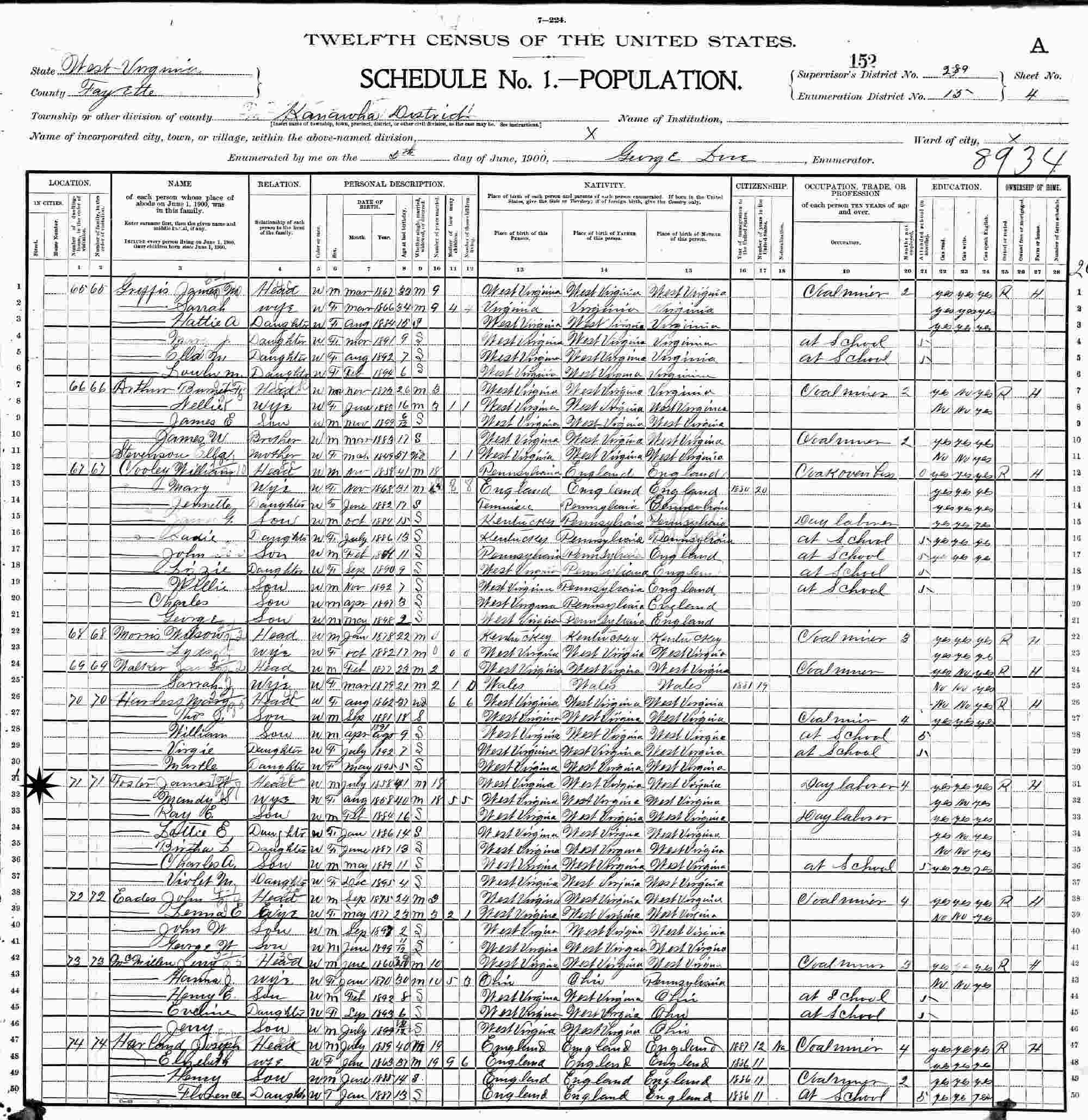 June 5, 1900 - Supervisor's District 289, Enumeration District 15, Kanawha District, Fayette County, West Virginia.