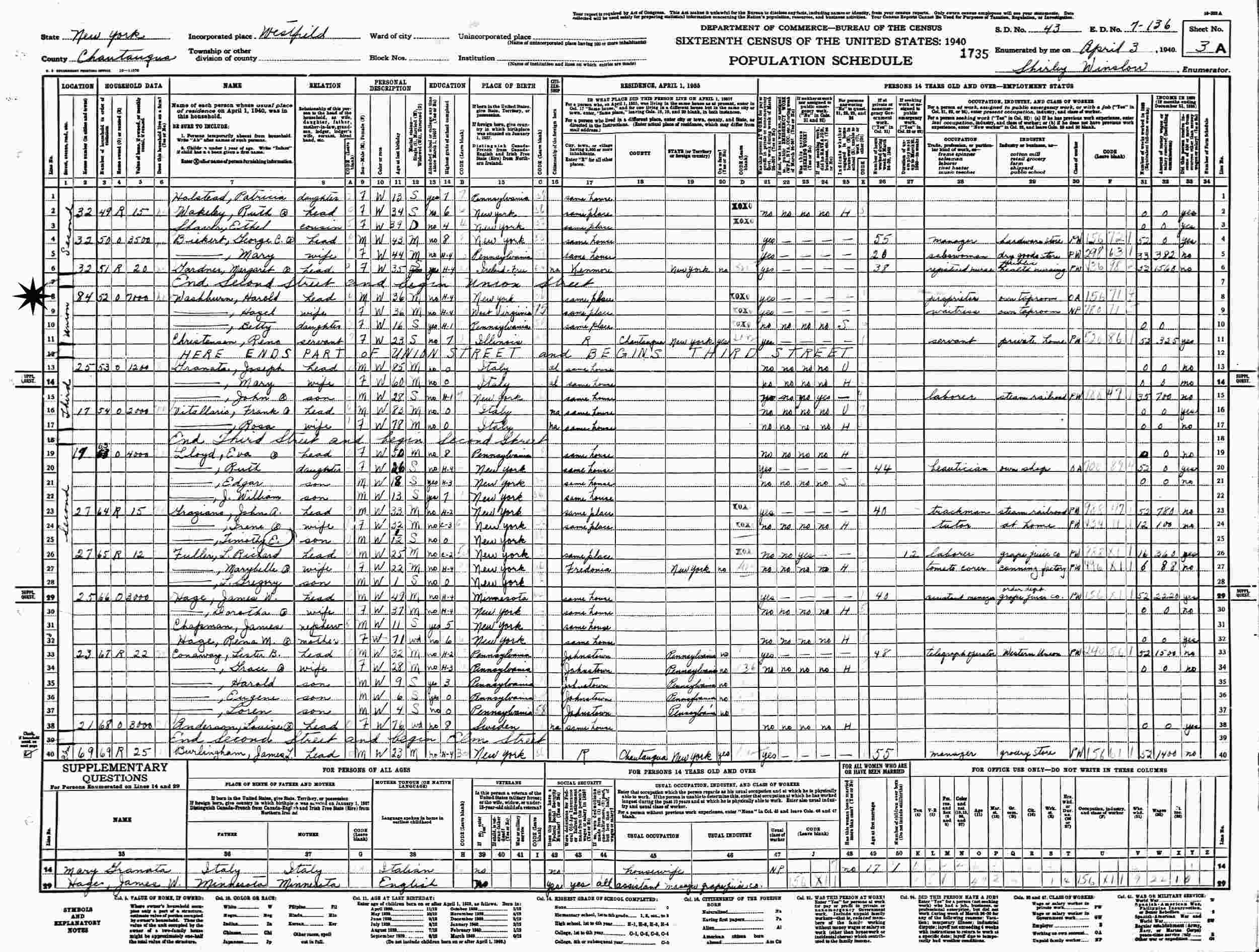 April 3, 1940 - 84 Union, Supervisor's District 43, Enumeration District 7-136, Westfield, Chautauqua County, New York.