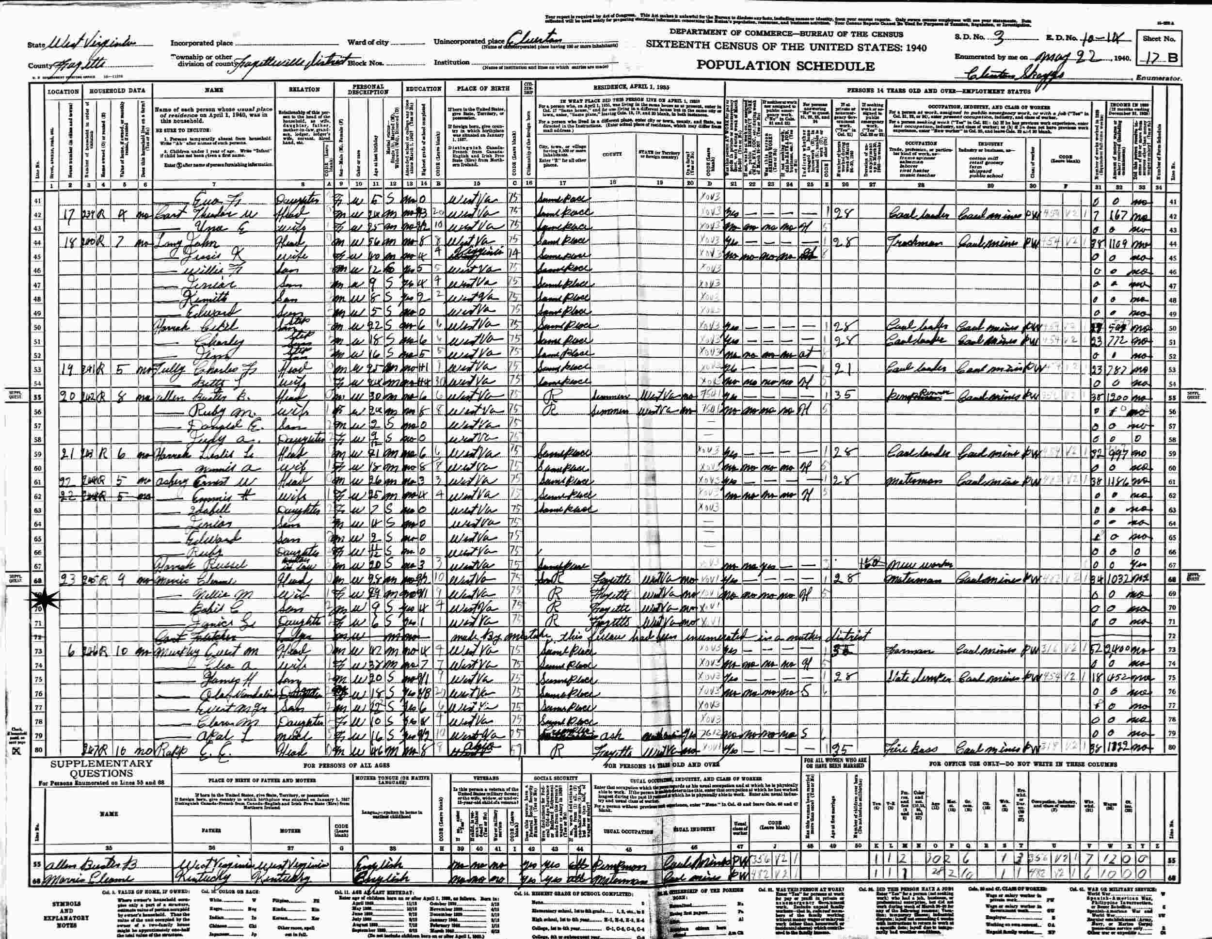 May 22, 1940 - Supervisor's District 3, Enumeration District 10-14, Fayetteville, Clurton?, Fayette County, West Virginia.