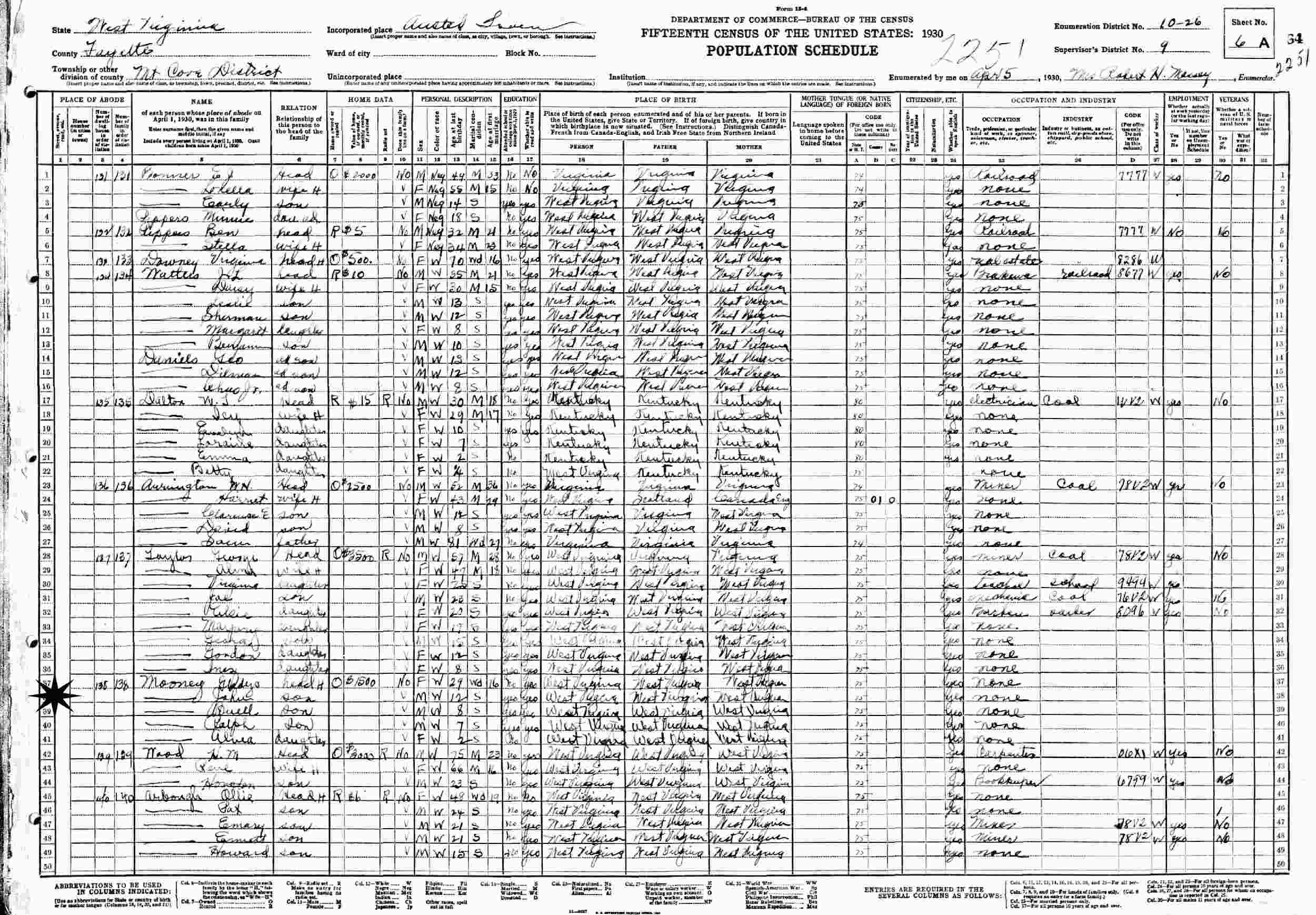 April 5, 1930 - Supervisor's 9, Enumeration District 10-26, Cove District, Amsted Town, Fayette County, West Virginia.
