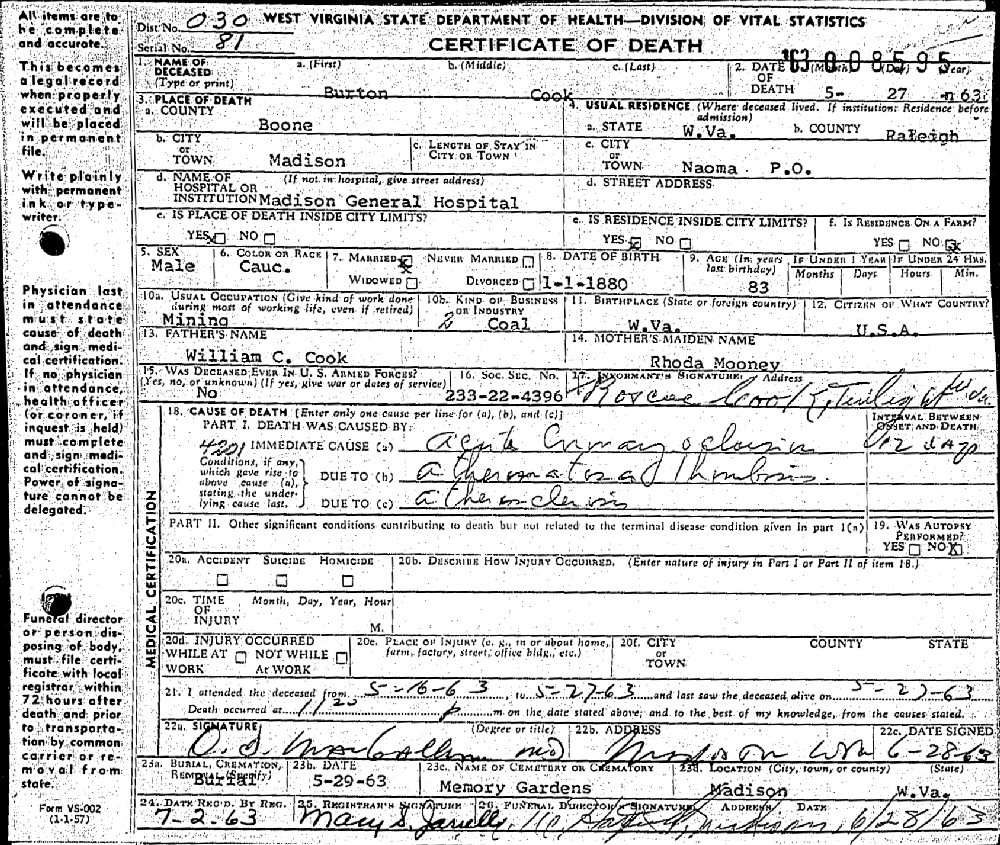 Died: May 27, 1963 in Madison, Boone County, West Virginia.