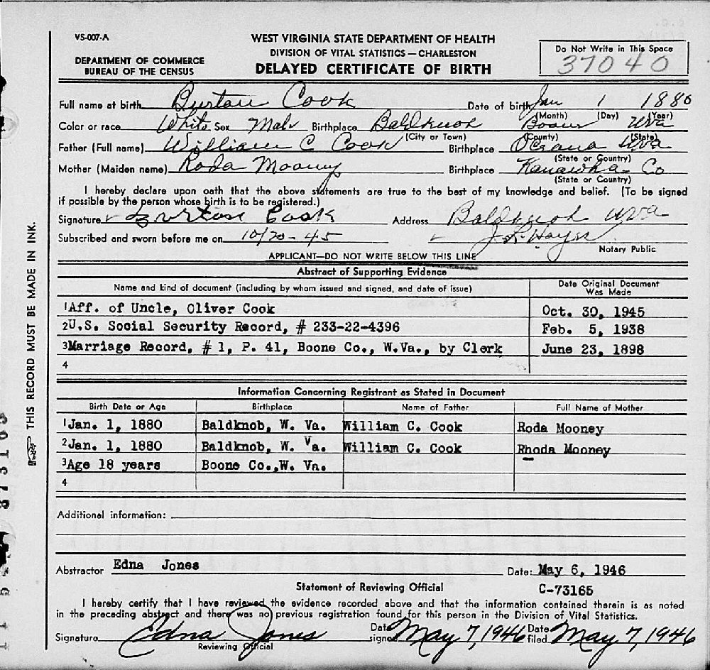 Son of William Chapman and Rhoda M (Mooney) Cook.
