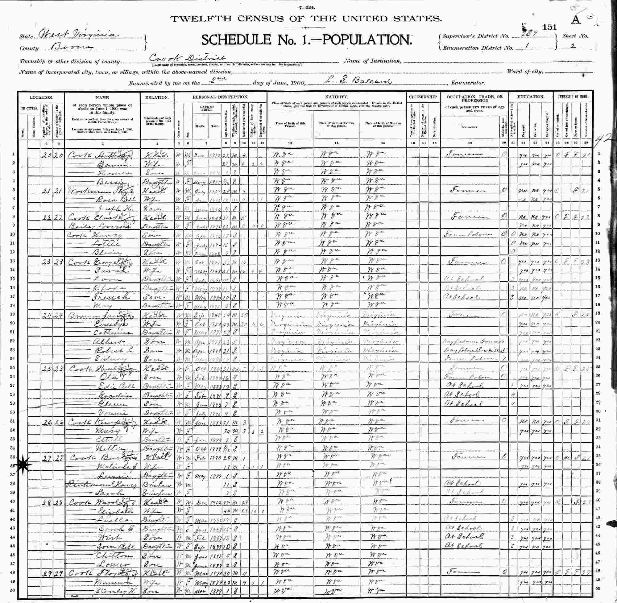 June 2, 1900 - Supervisor's District 289, Enumeration District 1, Crook District, Boone County, West Virginia.