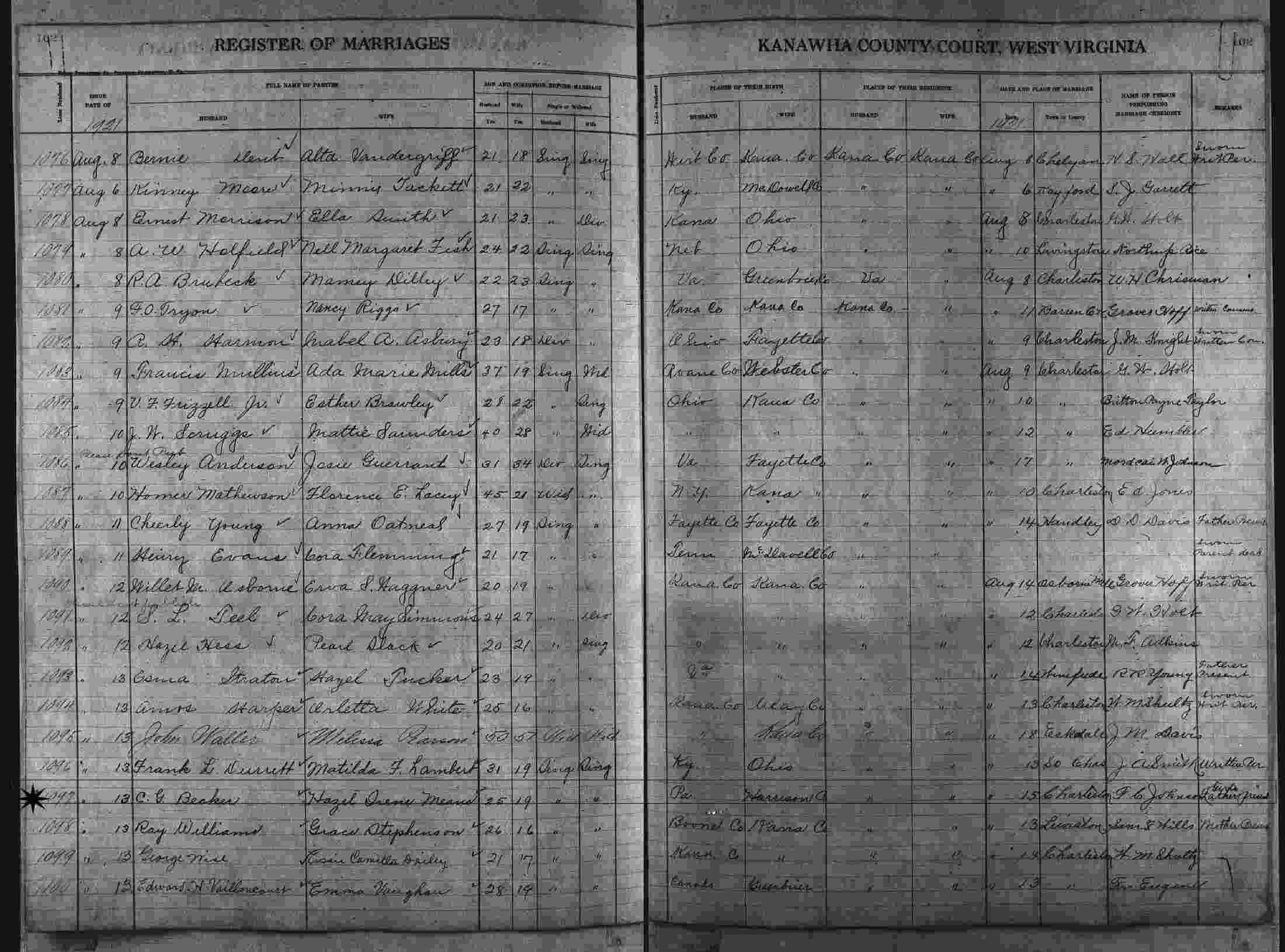 Married: Hazel Irene Means in August 15, 1921 in Charleston, Kanawha County, West Virginia. (Marriage License: August 13, 1921.)