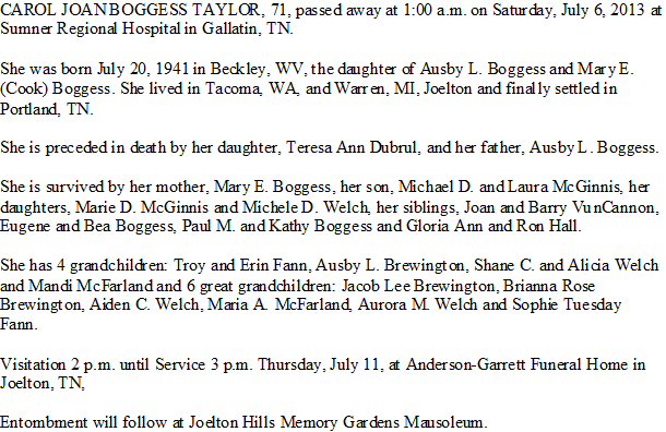 Notes for CAROL JEAN BOGGESS MCGINNIS TAYLOR: