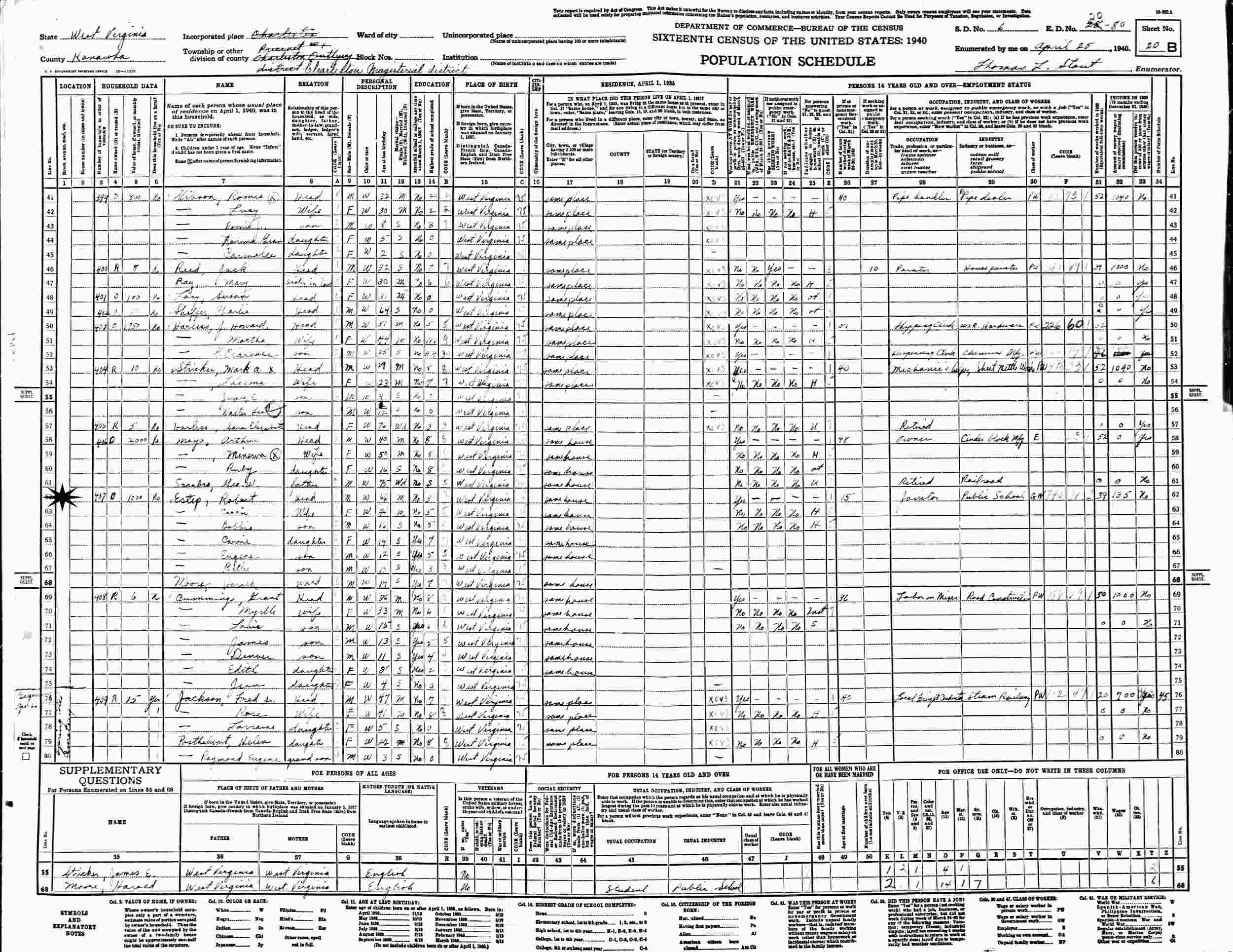 April 25, 1940 - Supervisor's District 6, Enumeration District 28-80 (crossed out to 20-80), Charleston, Kanawha County, West Virginia.