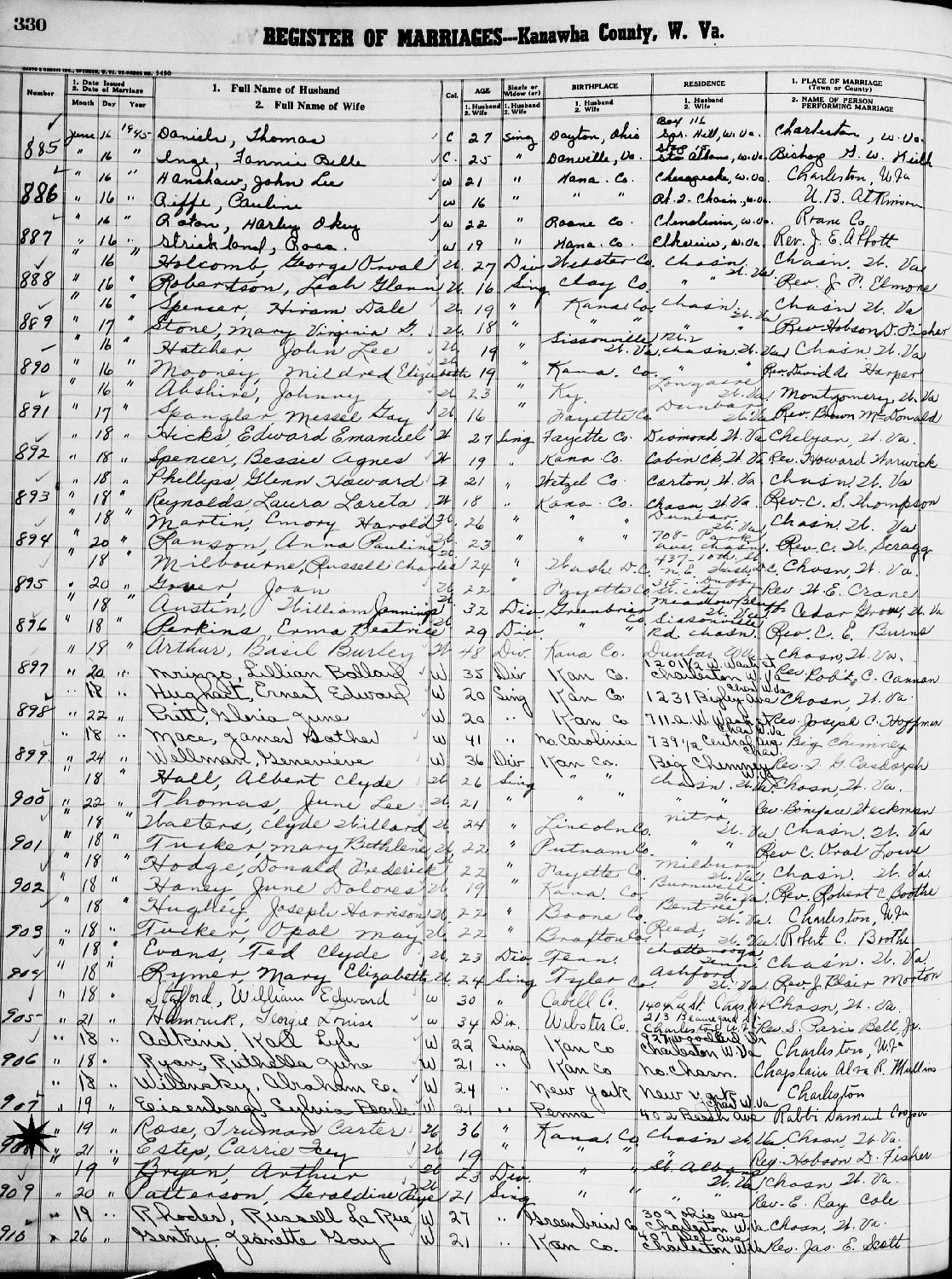 Married: Truman Carter Rose June 21, 1945 in Charleston, Kanawha County, West Virginia. (Marriage License: June 19, 1945.)