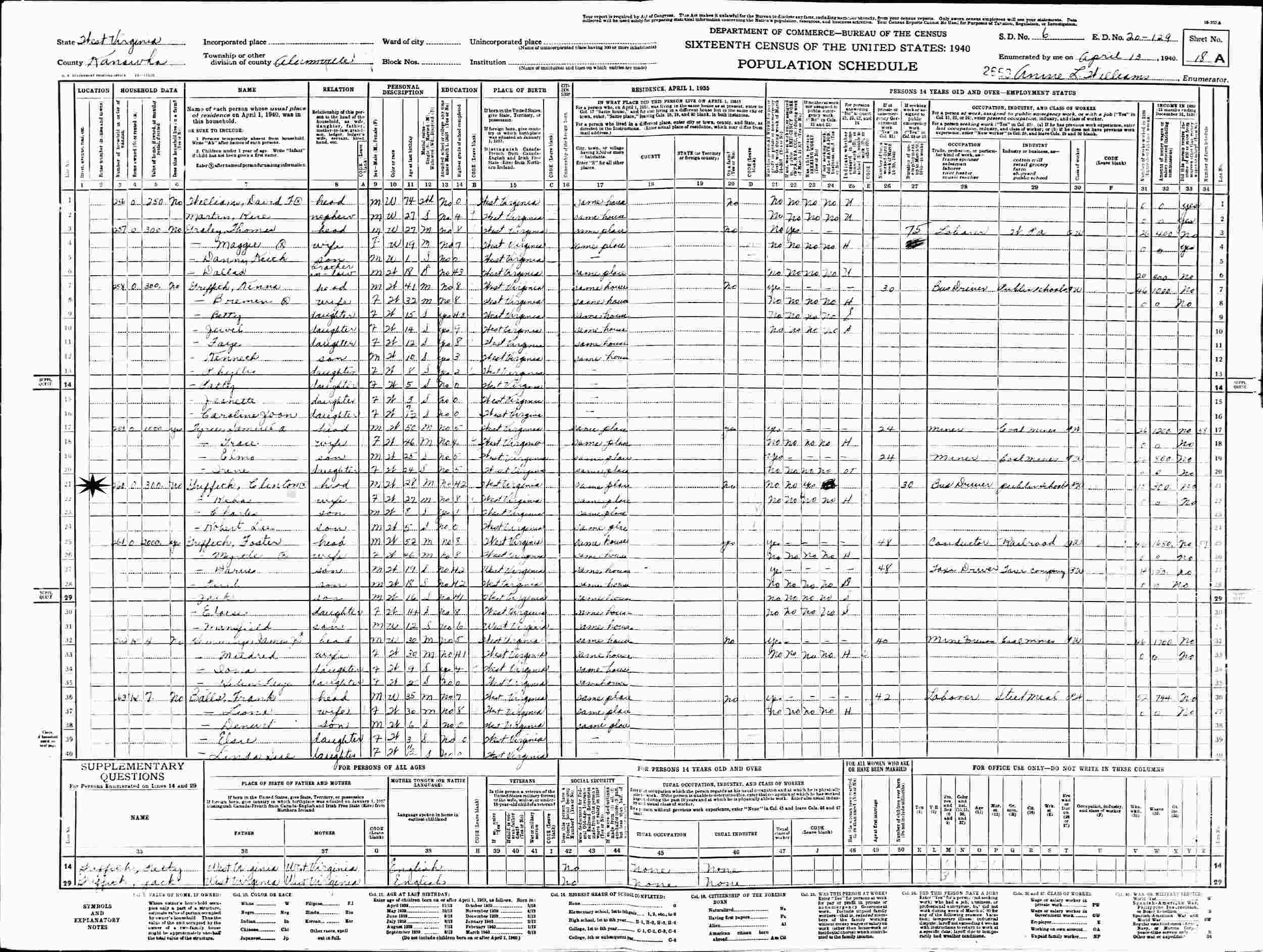 April 13, 1940 - Supervisor's District 6, Enumeration District 20-129. Alumville, Kanawha County, West Virginia.