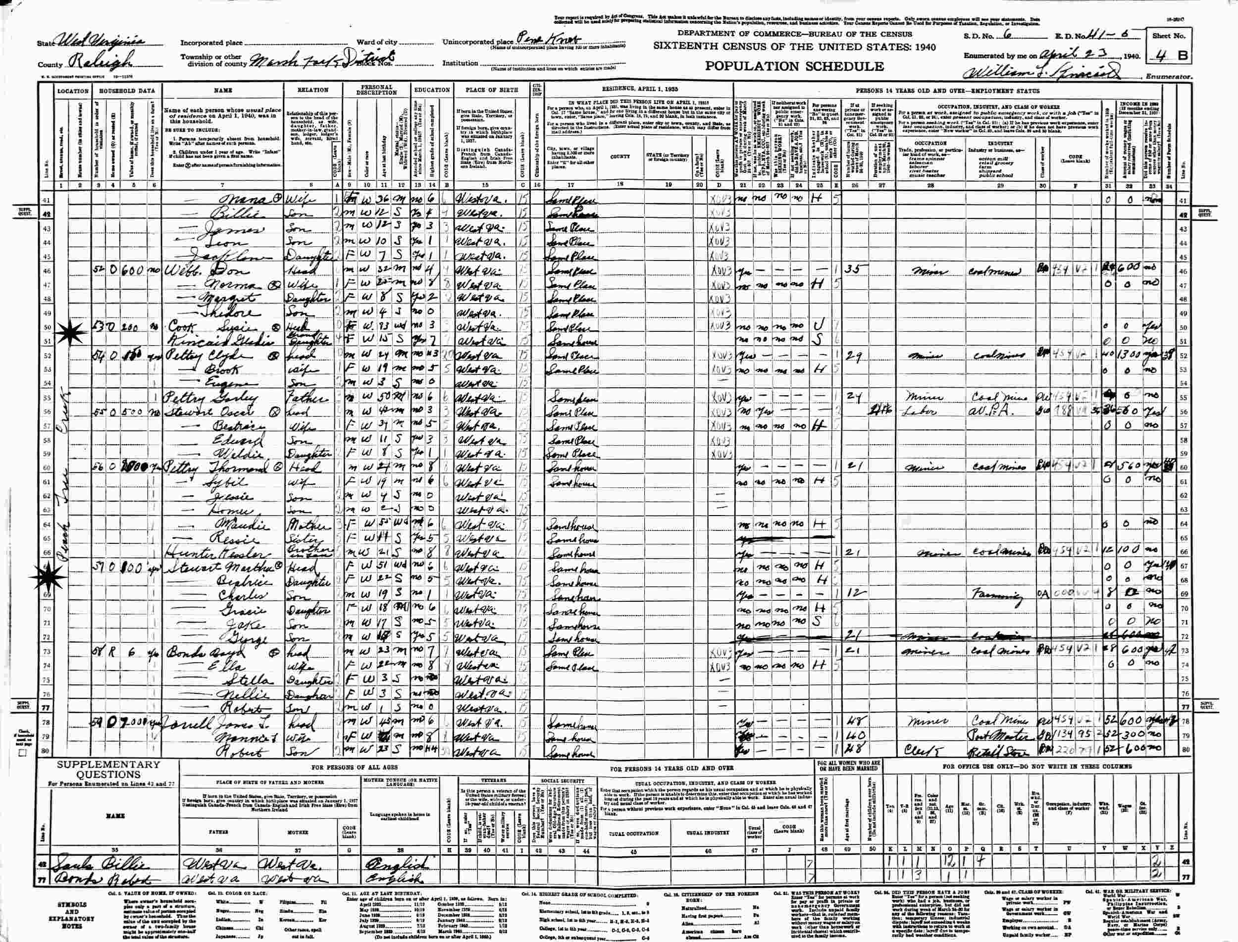 April 23, 1940 - Peach Tree Creek, Supervisor's District 6, Enumeration District 41-5, Marsh Fork Magisterial District, Pine Knob, Raleigh County, West Virginia.