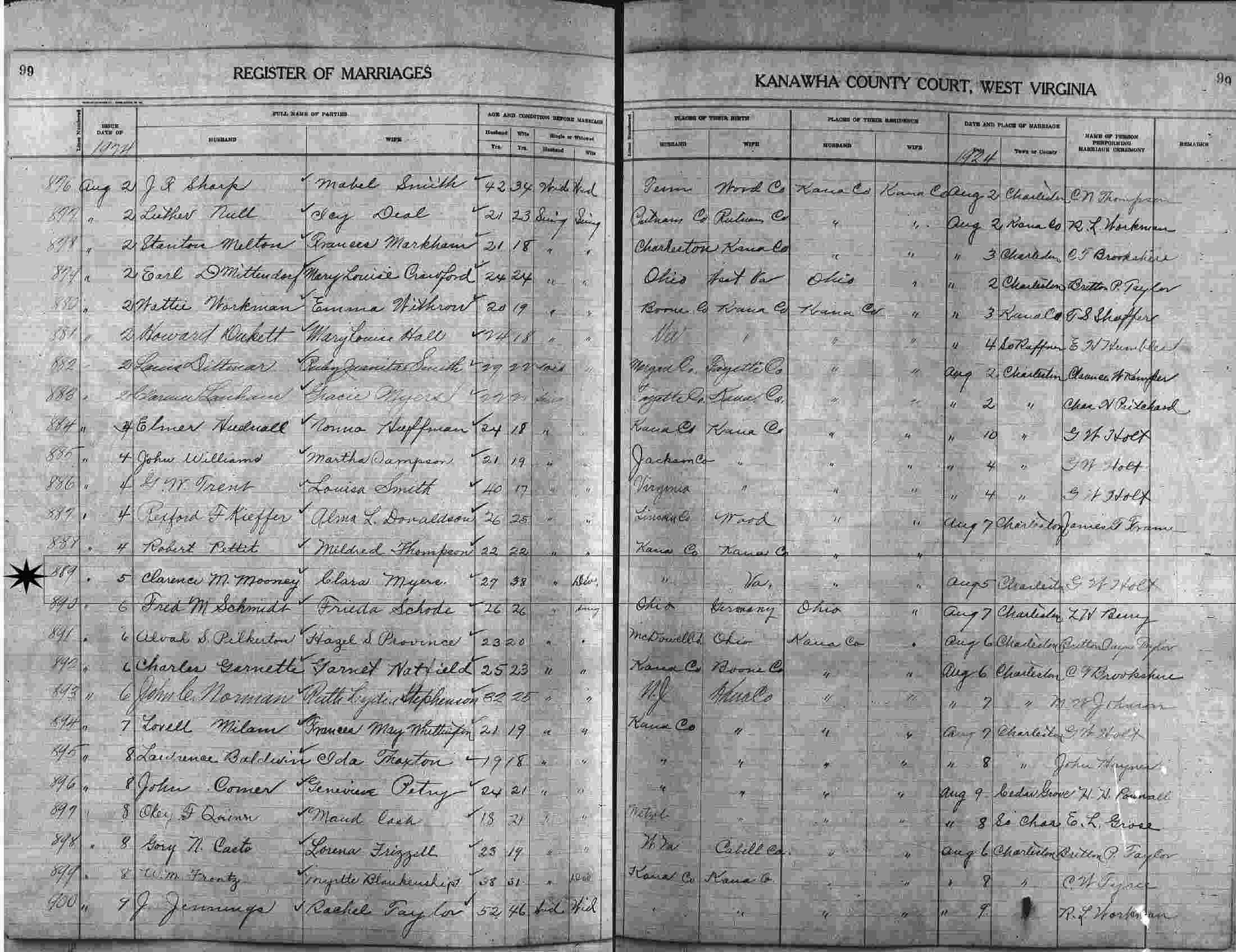 Married: Clarence Moos Mooney August 5, 1924 in Charleston, Kanawha County, West Virginia.