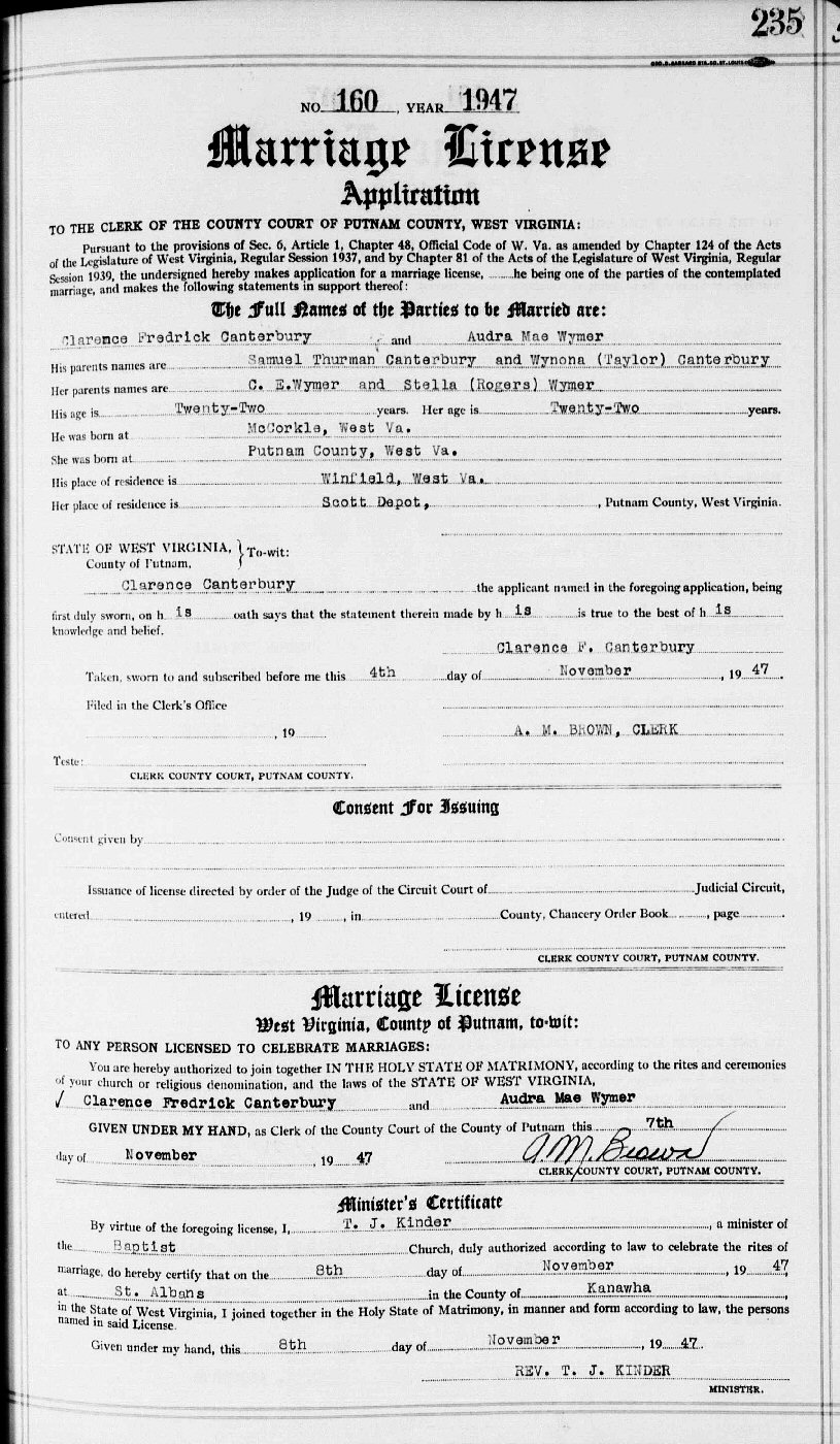 Married: Audra Mae Wymer November 8, 1947 in St. Albans, Kanawha County, West Virginia.