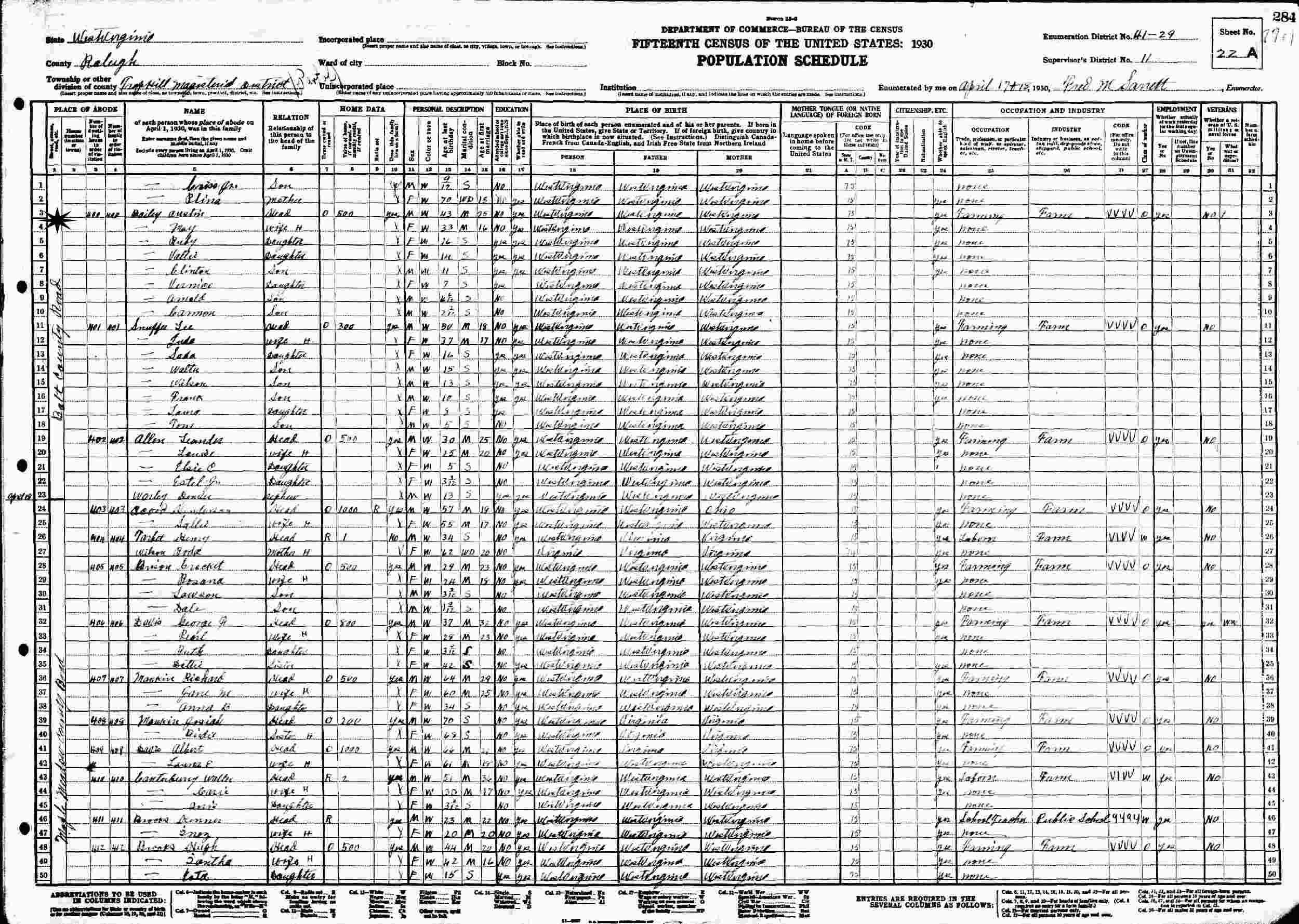 April 17-18, 1930 - Bolt County Road, Supervisor's District 11, Enumeration District 41-29, Trap Hill Magisterial District, Raleigh County, West Virginia.