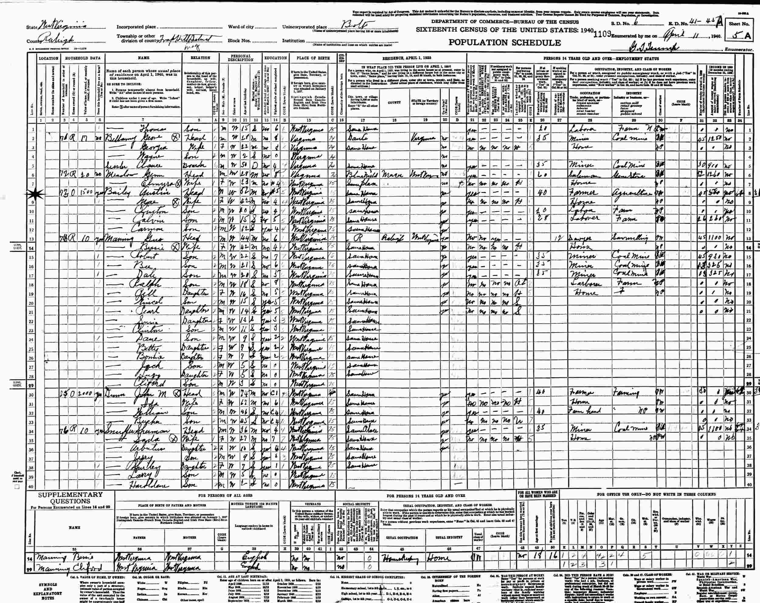 April 11, 1940 - Supervisor's District 6, Enumeration District 41-45, Trap Hill Magisterial District, Bolt, Raleigh County, West Virginia.