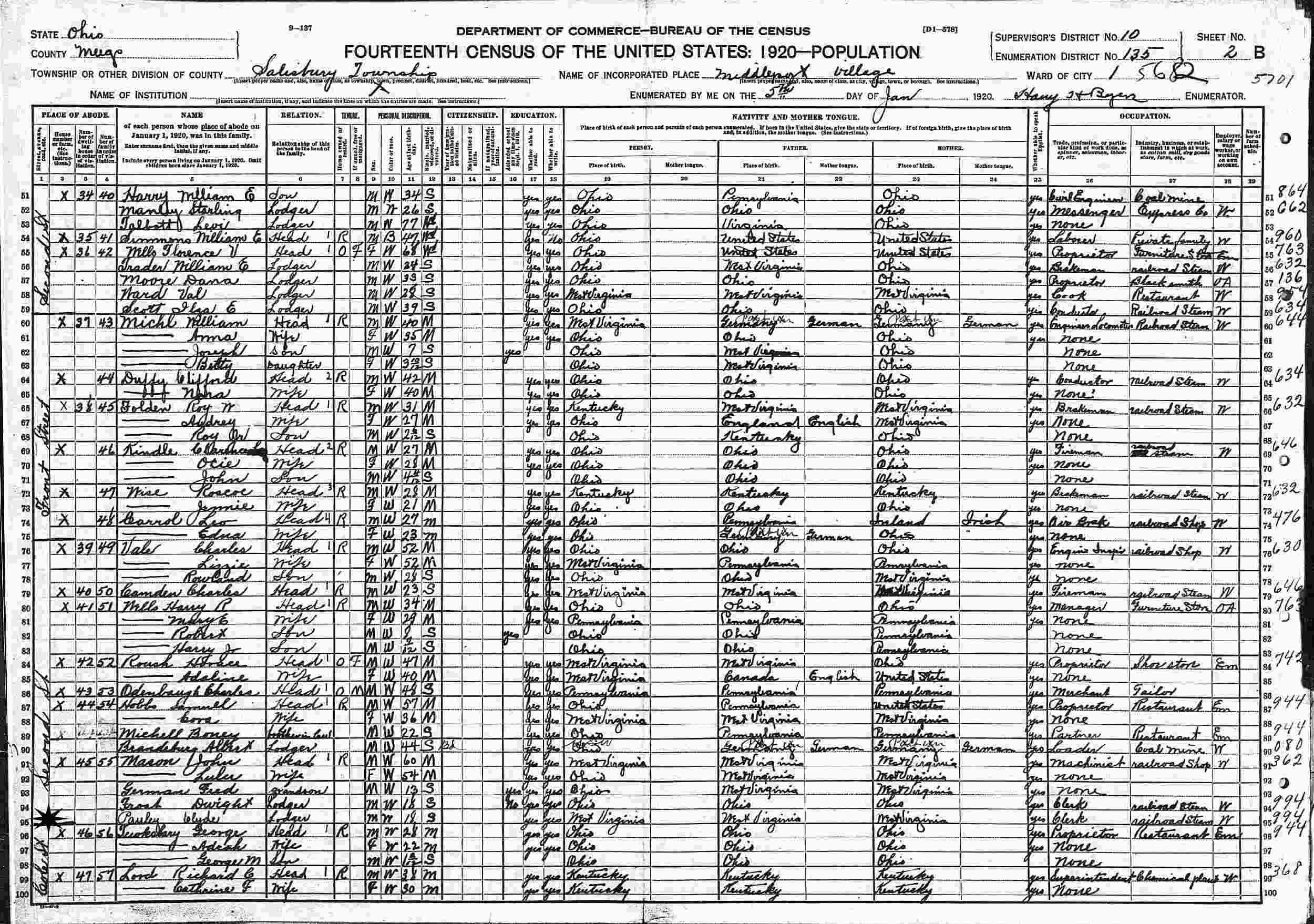 January 5, 1920 - Second Street, Ward 1, Supervisor's District 10, Enumeration District 135, Salisbury Township, Middleport Village, Meigs County, Ohio (Lodger).