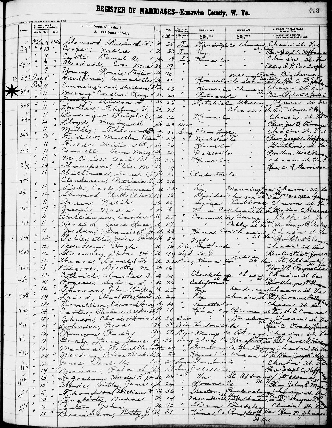 Married: William Stanley Cummingham, Jr. February 11, 1946 in Charleston, Kanawha County, West Virginia.