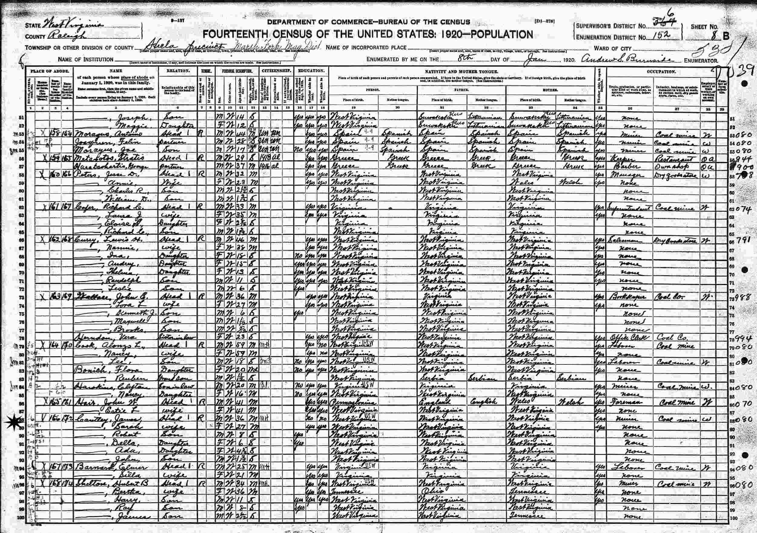 January 8, 1920 - Supervisor's District 367 (crossed out to 6), Enumeration District 152, Marsh Fork Magisterial District, Adicla? Precinct, Raleigh County, West Virginia.