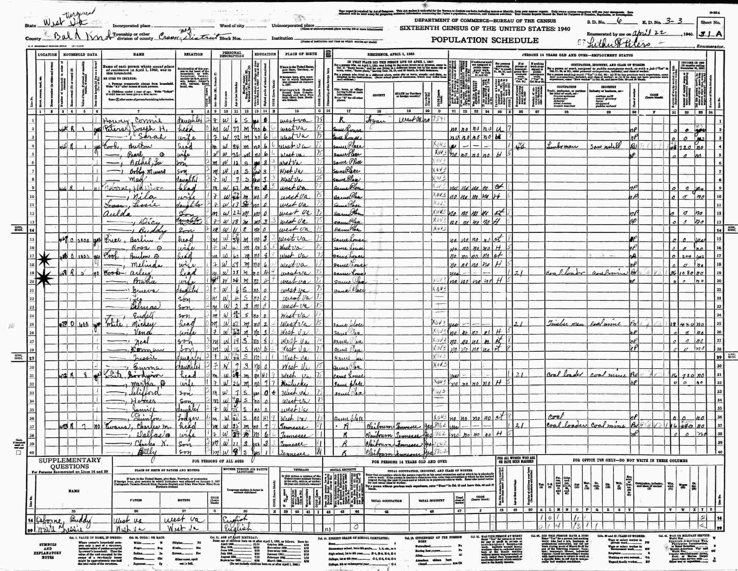 April 22, 1940 - Supervisor's District 6, Enumeration District 3-3, Crook Magisterial District, Bald Knob, Boone County, West Virginia.