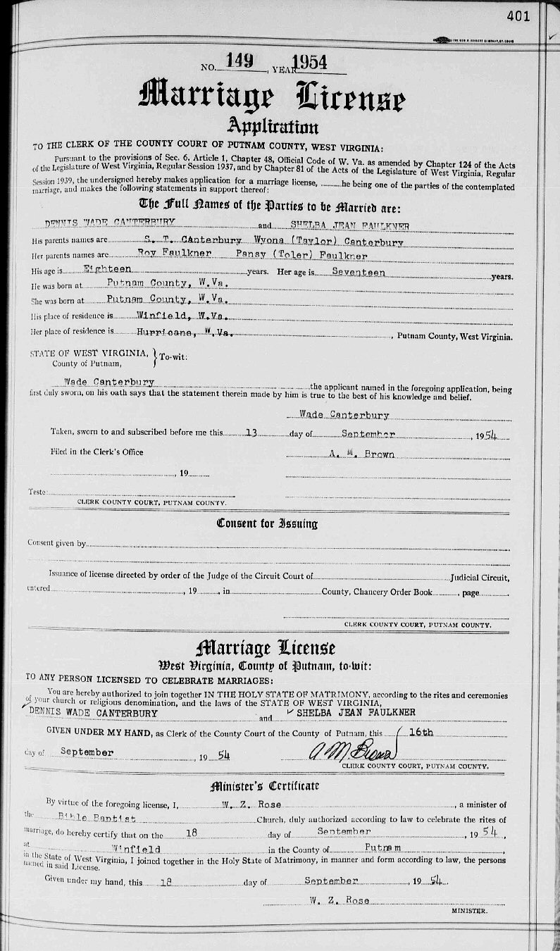 Married: Shelba Jean Faulkner September 18, 1954 in Winfield, Putnam County, West Virginia.