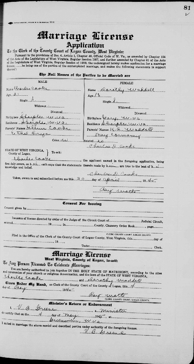 Married: Charles Douglas Cook May 4, 1945 in Greenville, Monroe County, West Virginia.