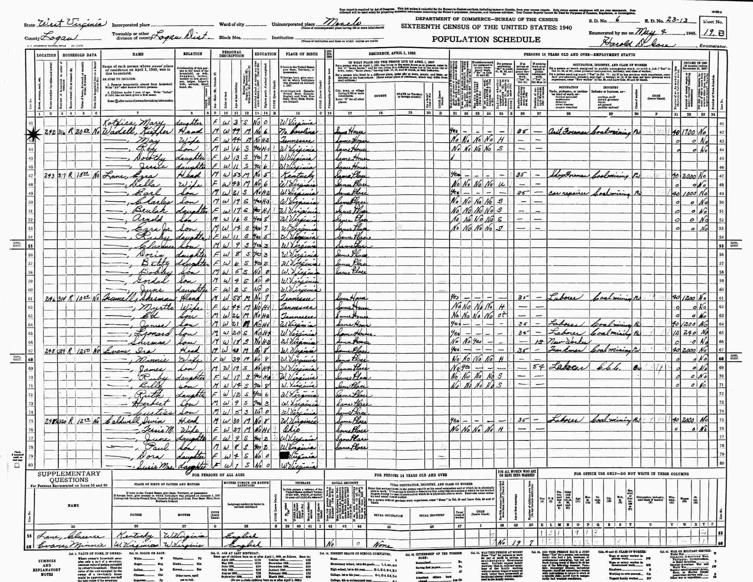 My 4, 1940 - Supervisor's District 6, Enumeration District 23-13, Manelo, Logan District, Logan County, West Virginia.