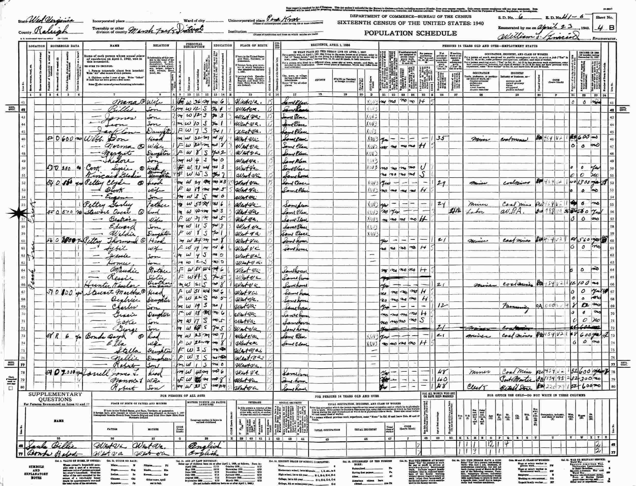 April 23, 1940 - Peach Tree Creek, Supervisor's District 6, Enumeration District 41-5, Marsh Fork District, Pine Knob, Raleigh County, West Virginia.