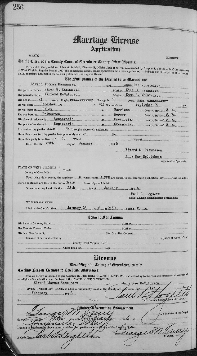 Married: Anna Rae McCutcheon February 9, 1946 in Greenbrier County, West Virginia. (Marriage License Application: January 28, 1946. Marriage License; February 1, 1946.)