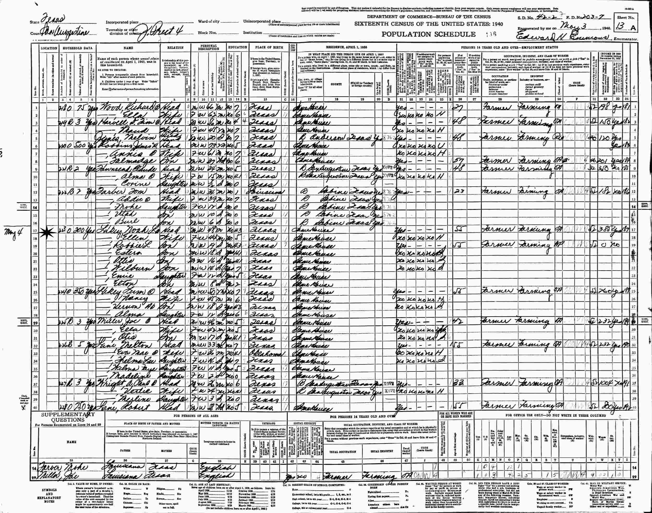 May 3, 1940 - J. Precinct 4, Supervisor's District 42-2, Enumeration District 203-7, San Augustine County, Texas.