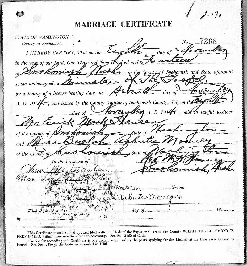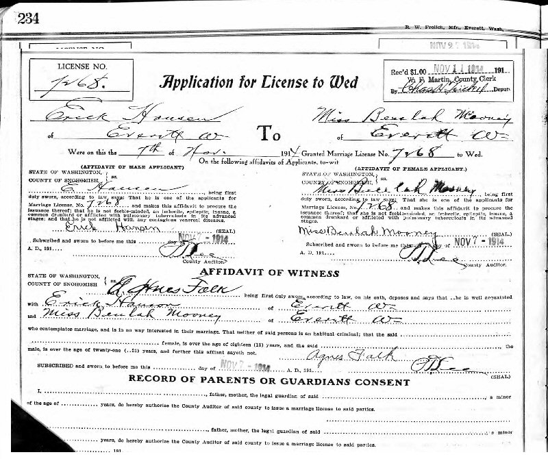 Married: (1) Beulah "Bula" Arbutis Mooney November 8, 1914 in Snohomish, Snohomish County, Washington.