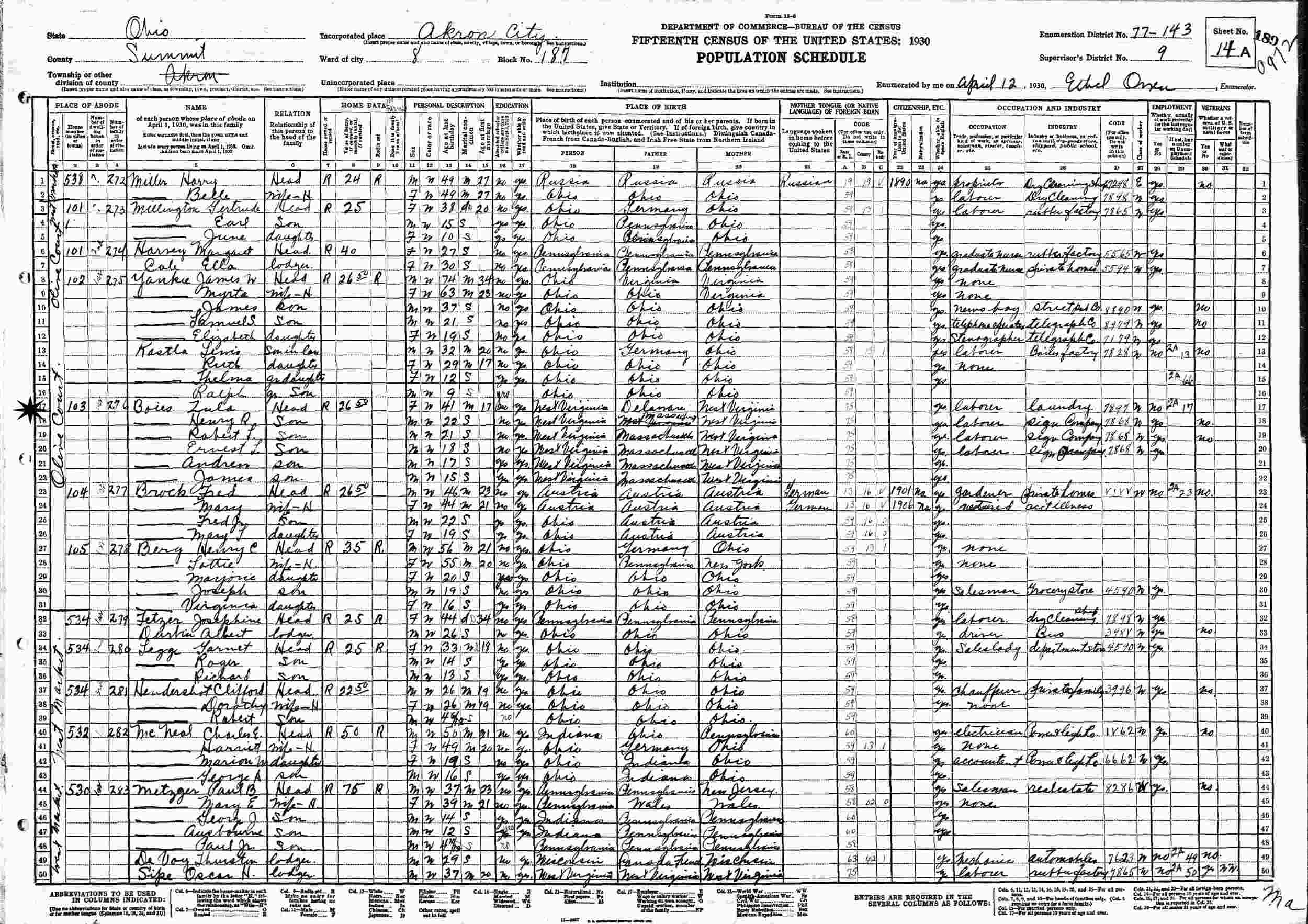 April 12, 1930 - 103 Oline Court, Ward 8, Block 187, Supervisor's District 9, Enumeration District 77-14, Akron, Summit County, Ohio.