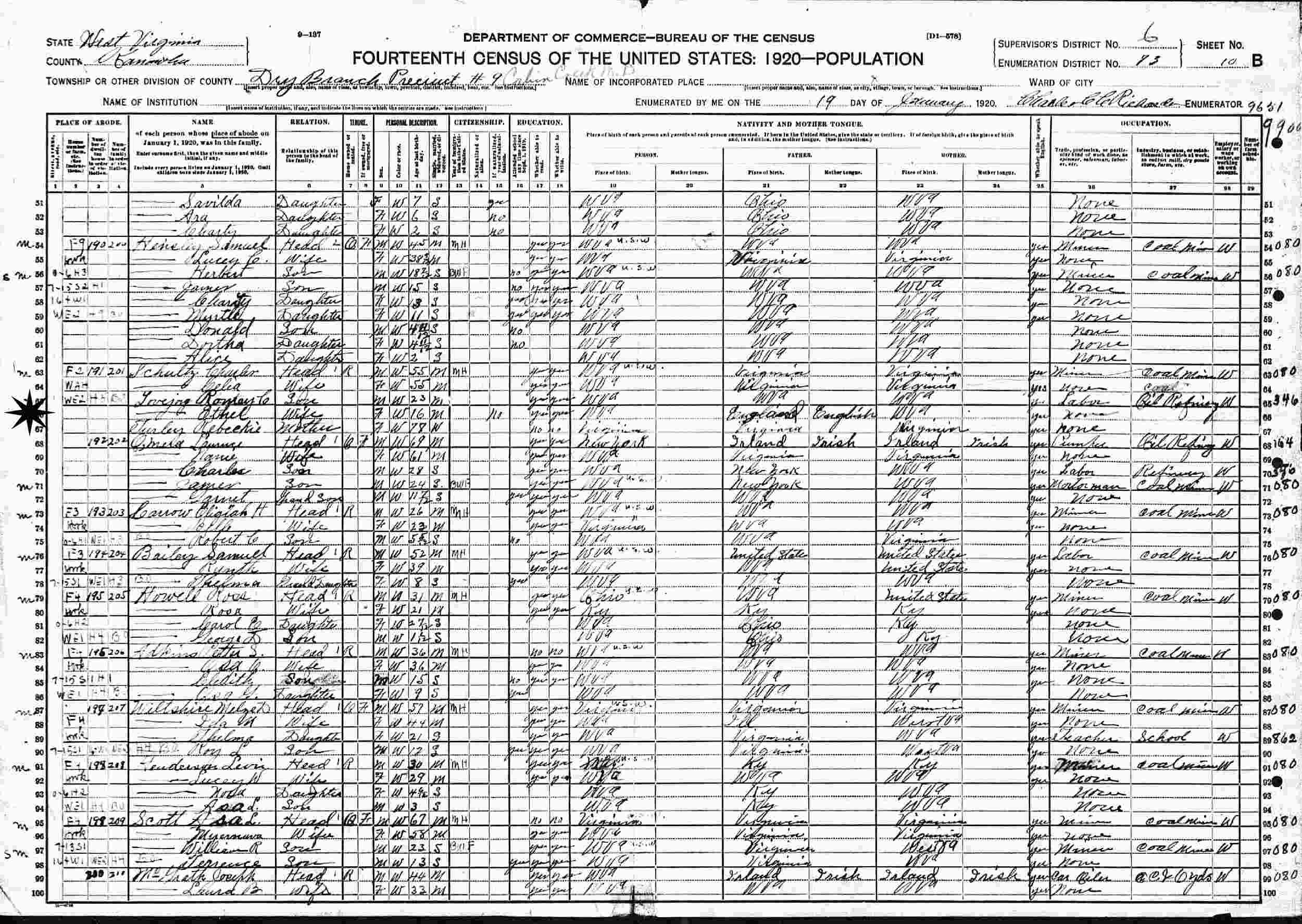 January 19, 1920 - Precinct 9, Supervisor's District 6, Enumeration District 73, Dry Branch, Cabin Creek Magisterial District, Kanawha County, West Virginia (w/stepfather and mother).