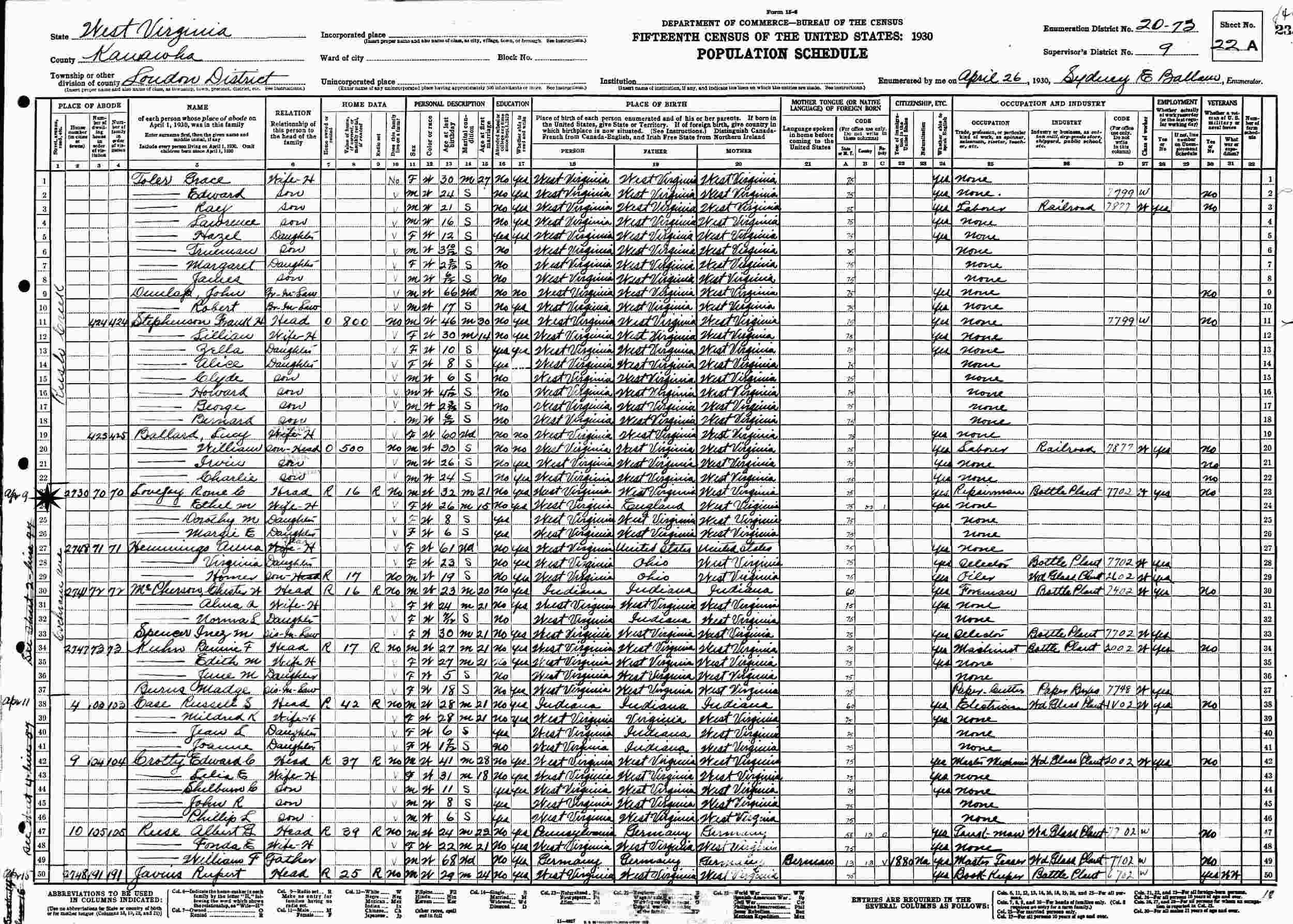 April 9, 1930 - Supervisor's District 9, Enumeration District 20-73, 2730 Cochran Avenue, Loudon District, Kanawha County, West Virginia.