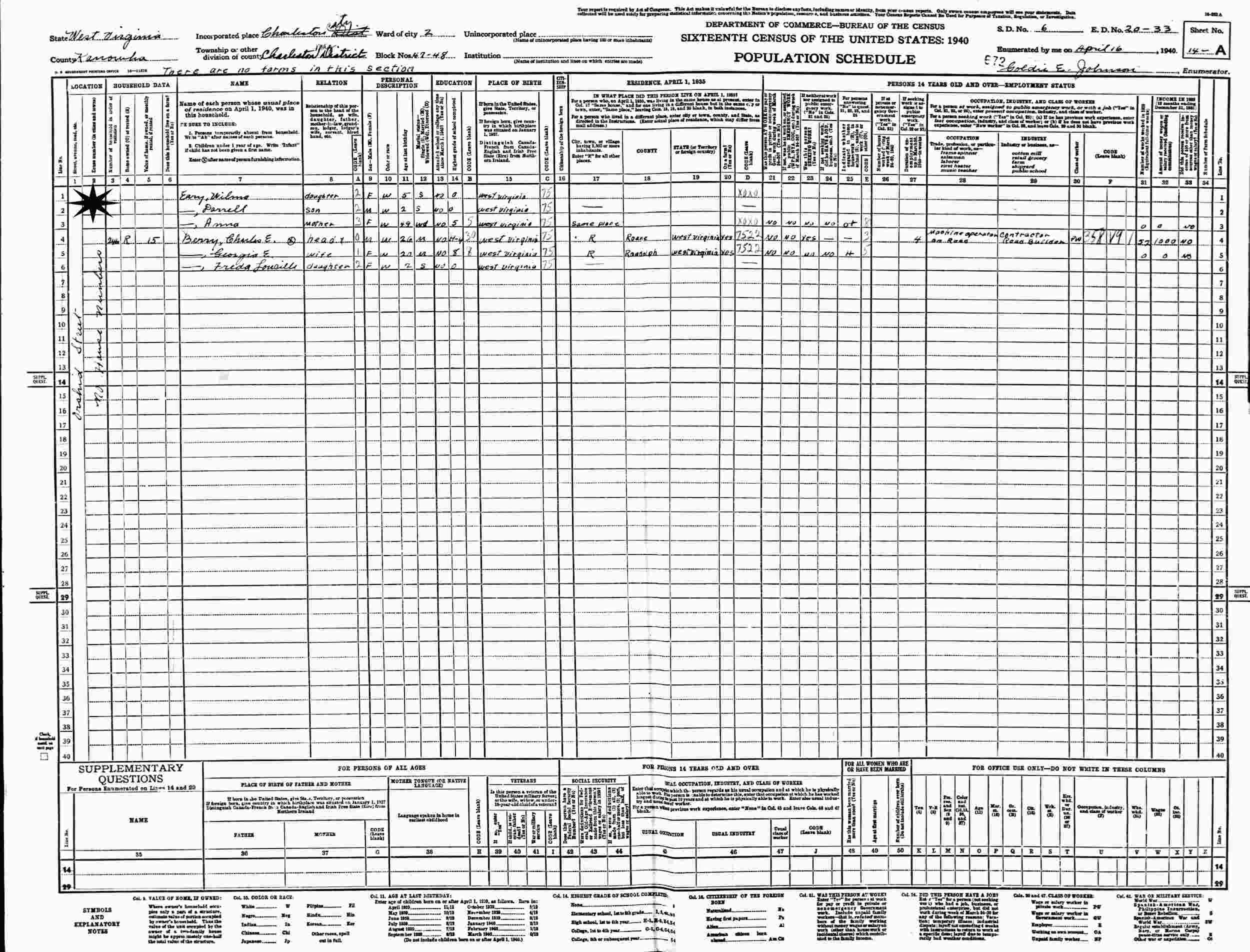 April 16, 1940 - Orchard Street, Ward 2, Blocks 46-52, Supervisor's District 6, Enumeration District 20-33, Charleston, Kanawha County, West Virginia.