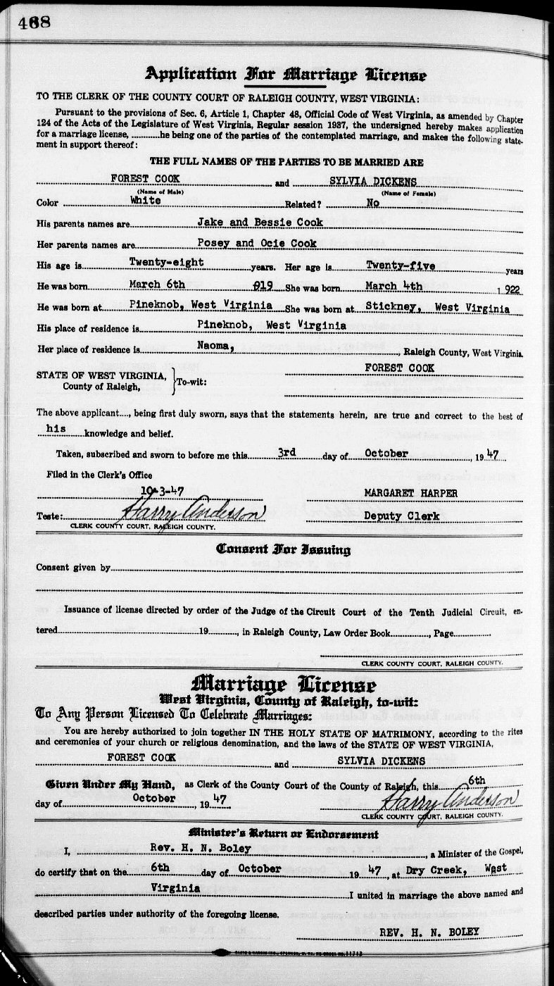(2) Sylvia Ethel Cook October 6, 1947 in Dry Creek, Raleigh County, West Virginia. (She married (1) Elbert Arlen Dickens November 7, 1941 in Arnett, Raleigh County, West Virginia.)