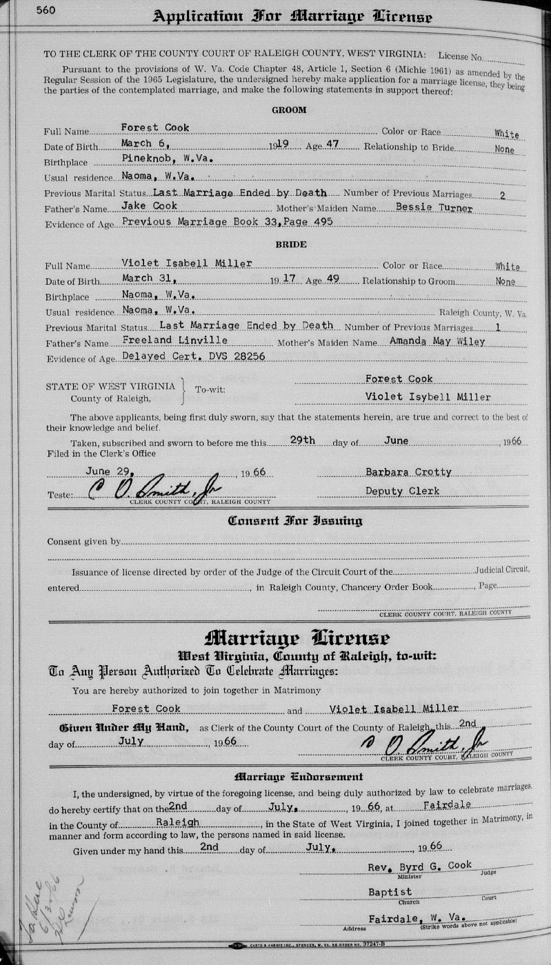 (3) Violet Isabell Linville July 2, 1966 in Fairdale, Raleigh County, West Virginia. (Marriage License: June 29, 1966.) (She married (1) Howard Miller 1938 in Raleigh County, West Virginia. He was b. December 24, 1904, Boone County, West Virginia; d. April 26, 1940-1965.)