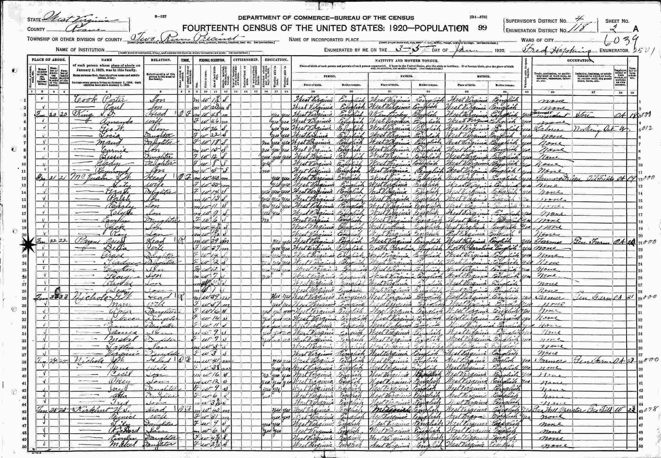 January 3-5, 1920 - Supervisor's District 4, Enumeration District 118, Two Run Precinct, Roane County, West Virginia.
