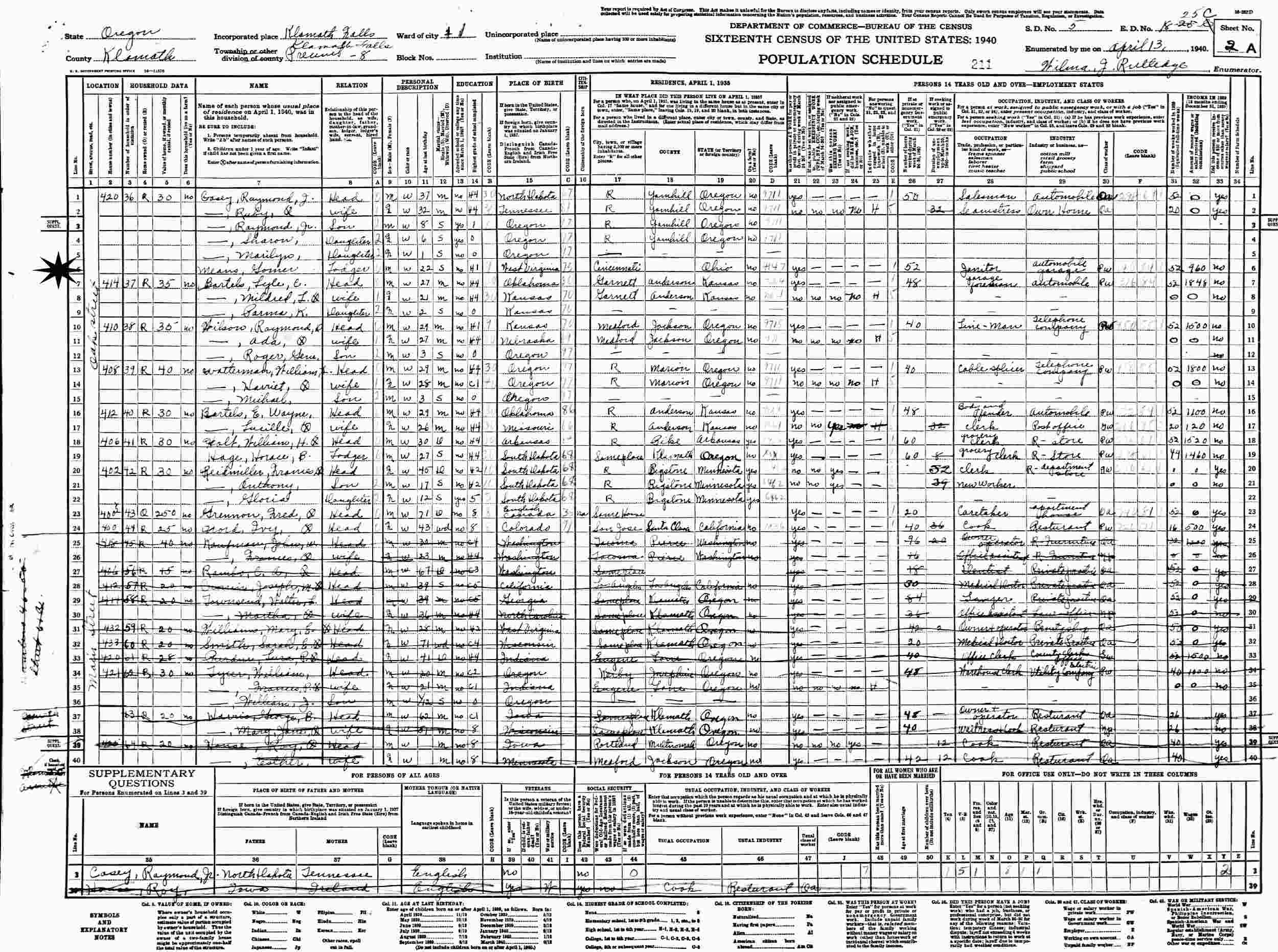 April 13, 1940 - 420 Oaks Street, Ward 11, Precinct 8, Supervisor's District 5, Enumeration District 18-25C, Klamath Falls, Klamath County, Oregon (Lodger).