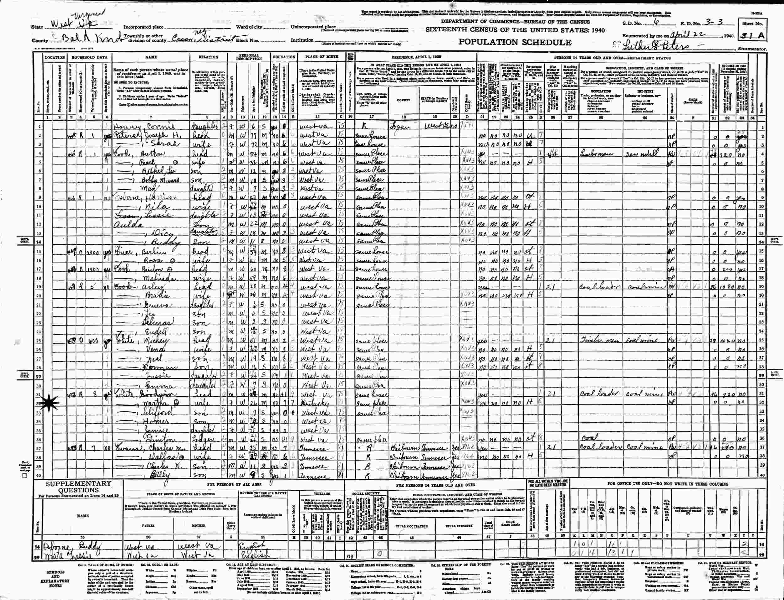 April 22, 1940 - Supervisor's District 6, Enumeration District 3-3, Crook Magisterial District, Bald Knob, Boone County, West Virginia.