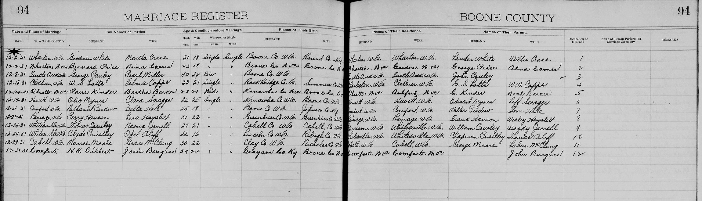 Married: Martha S Crase December 2, 1931 in Wharton, Boone County, West Virginia.