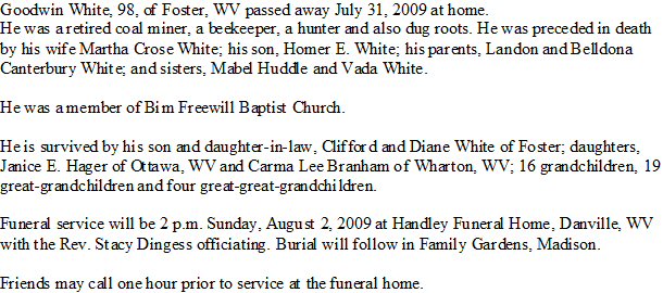 Died: July 31, 2009 in Foster, Boone County, West Virginia