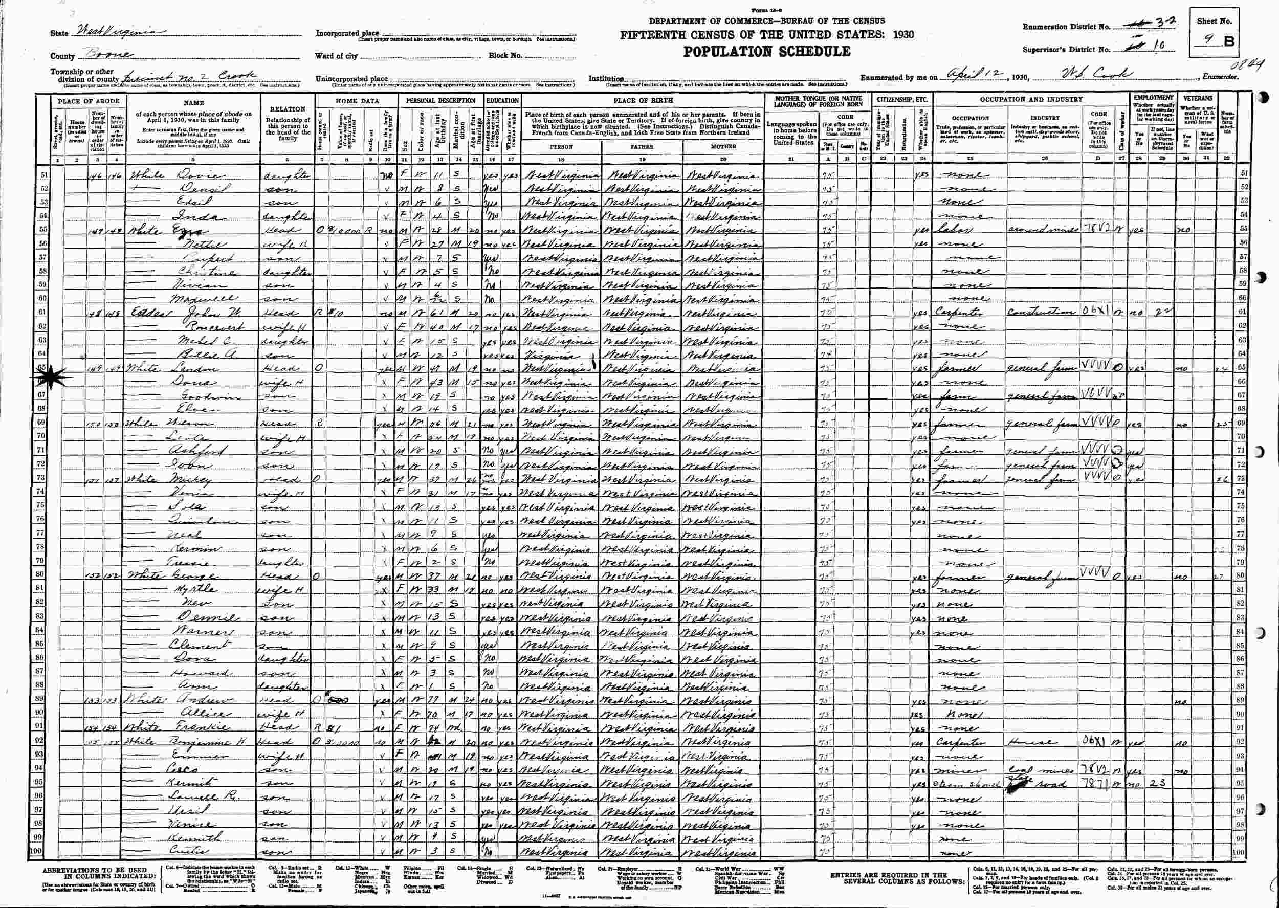 April 10, 1930 - Precinct 2, Supervisor's District 10, Enumeration District 3-2, Crook Magisterial District, Boone County, West Virginia.