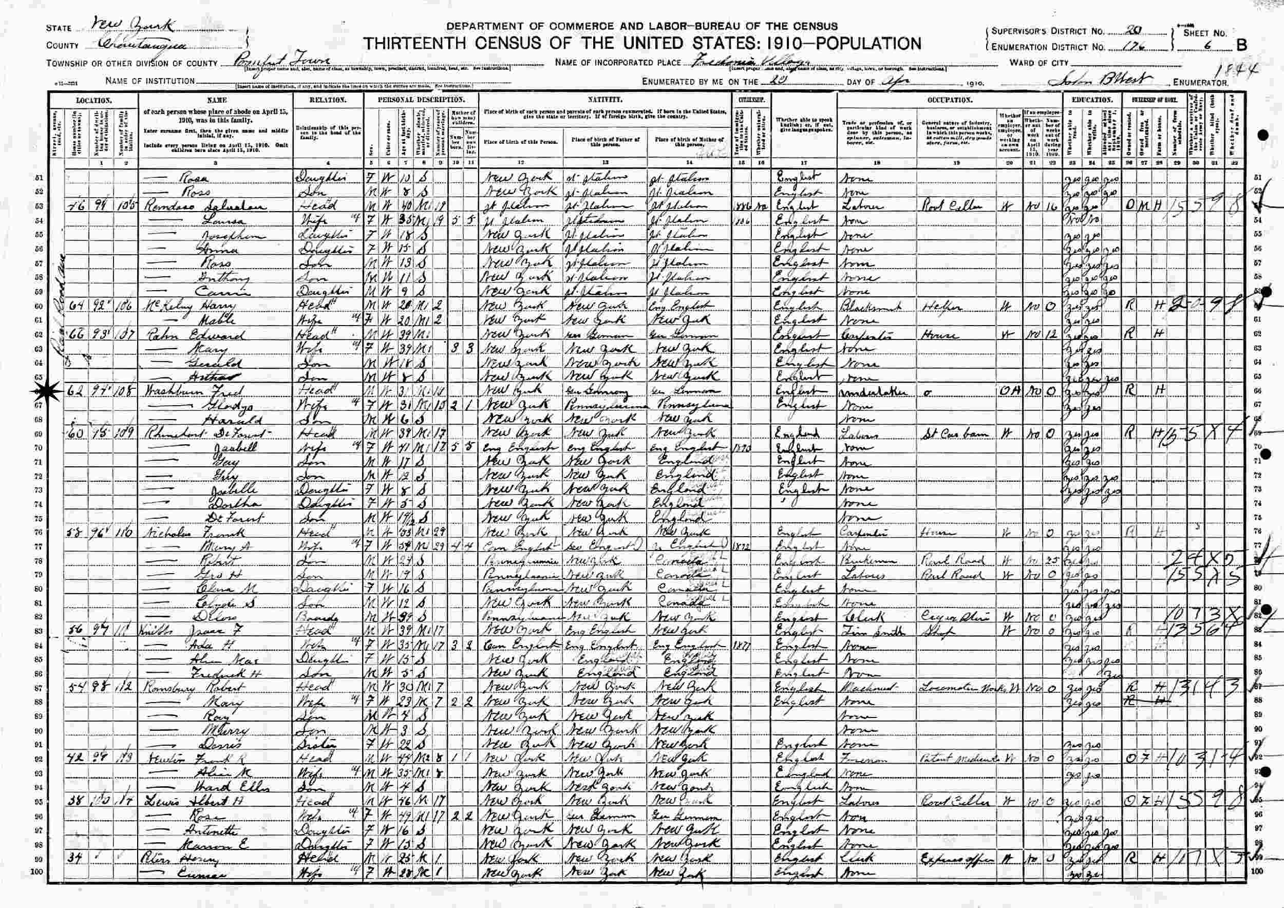 April 20, 1910 - 62 Rail Road Avenue, Supervisor's District 20, Enumeration District 176, Pomfret Town, Fredonia Village, Chautauqua County, New York.