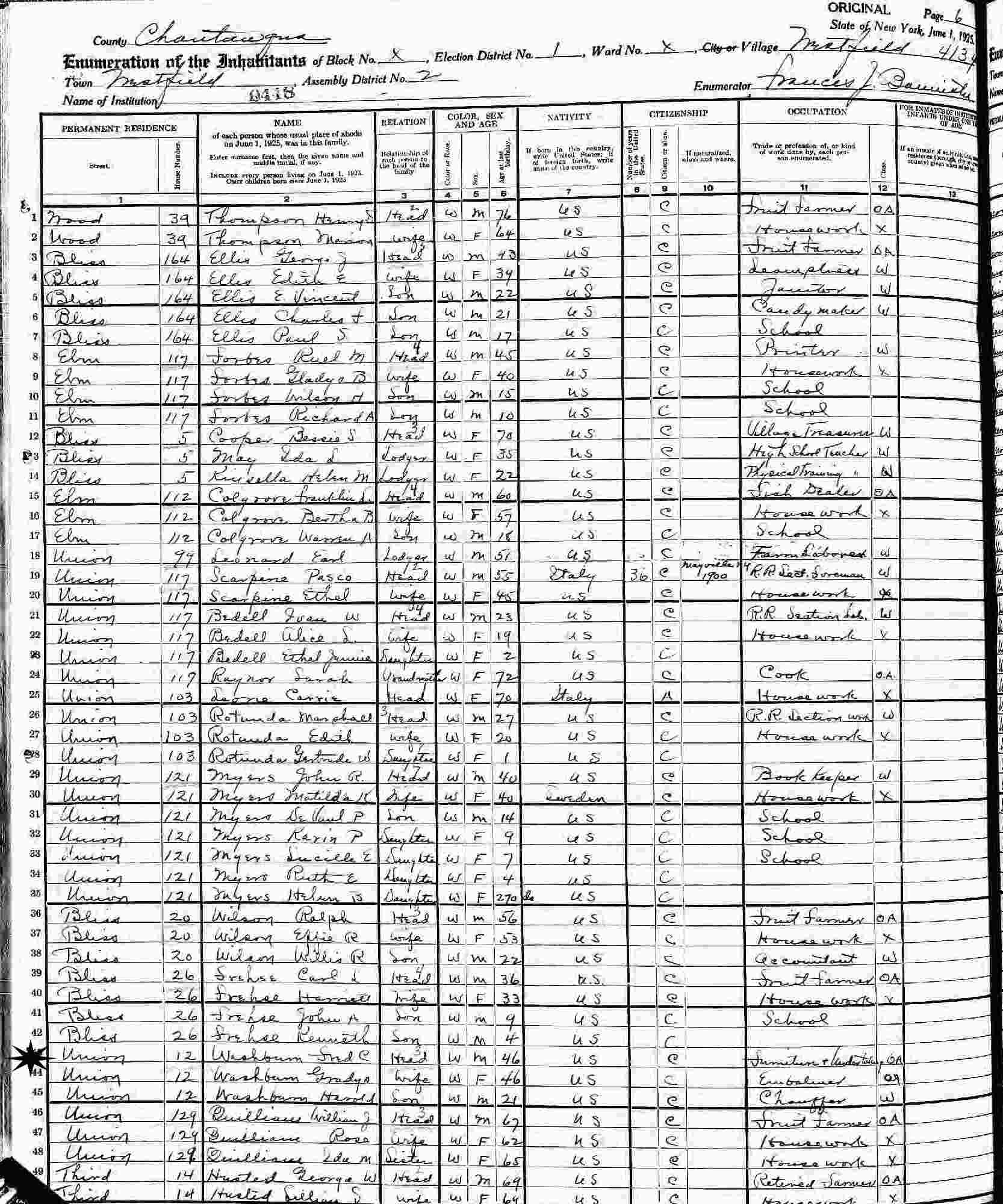 June 1, 1925 - New York State - 12 Union, Assembly District 2, Election District 1, Westfield, Chautauqua County, New York
