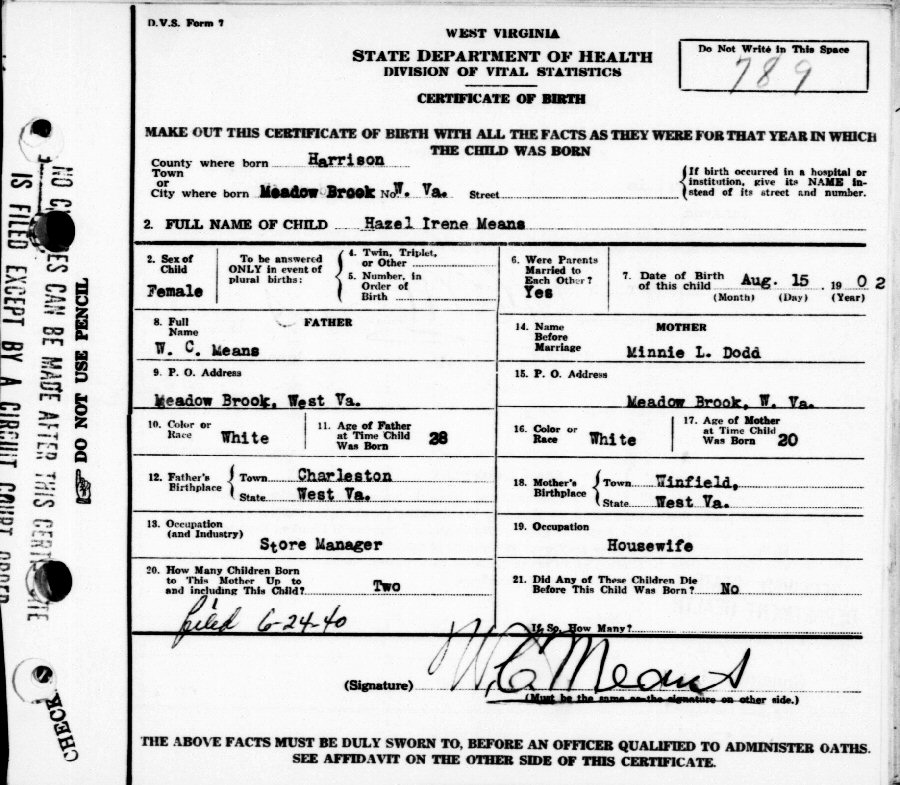 Born: August 15, 1902 in Meadow Brook, Harrison County, West Virginia.